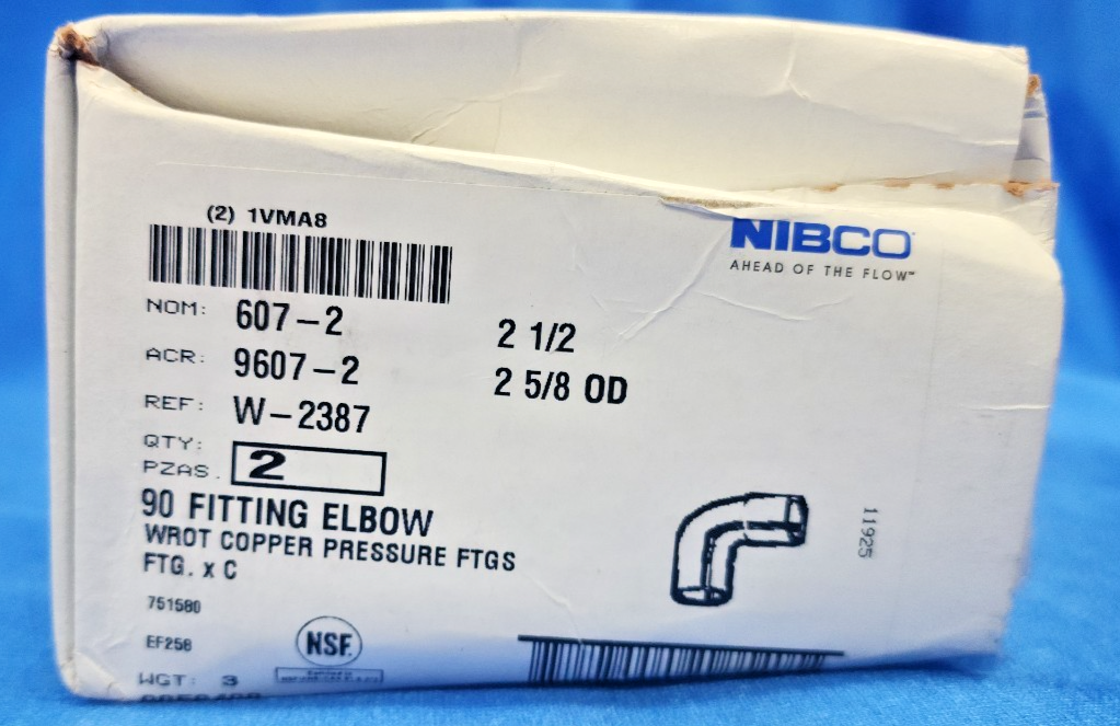 Nibco 607-2 2.5" Copper 90° Elbow Fitting FTG x C, Wrot Pressure New, Open Box