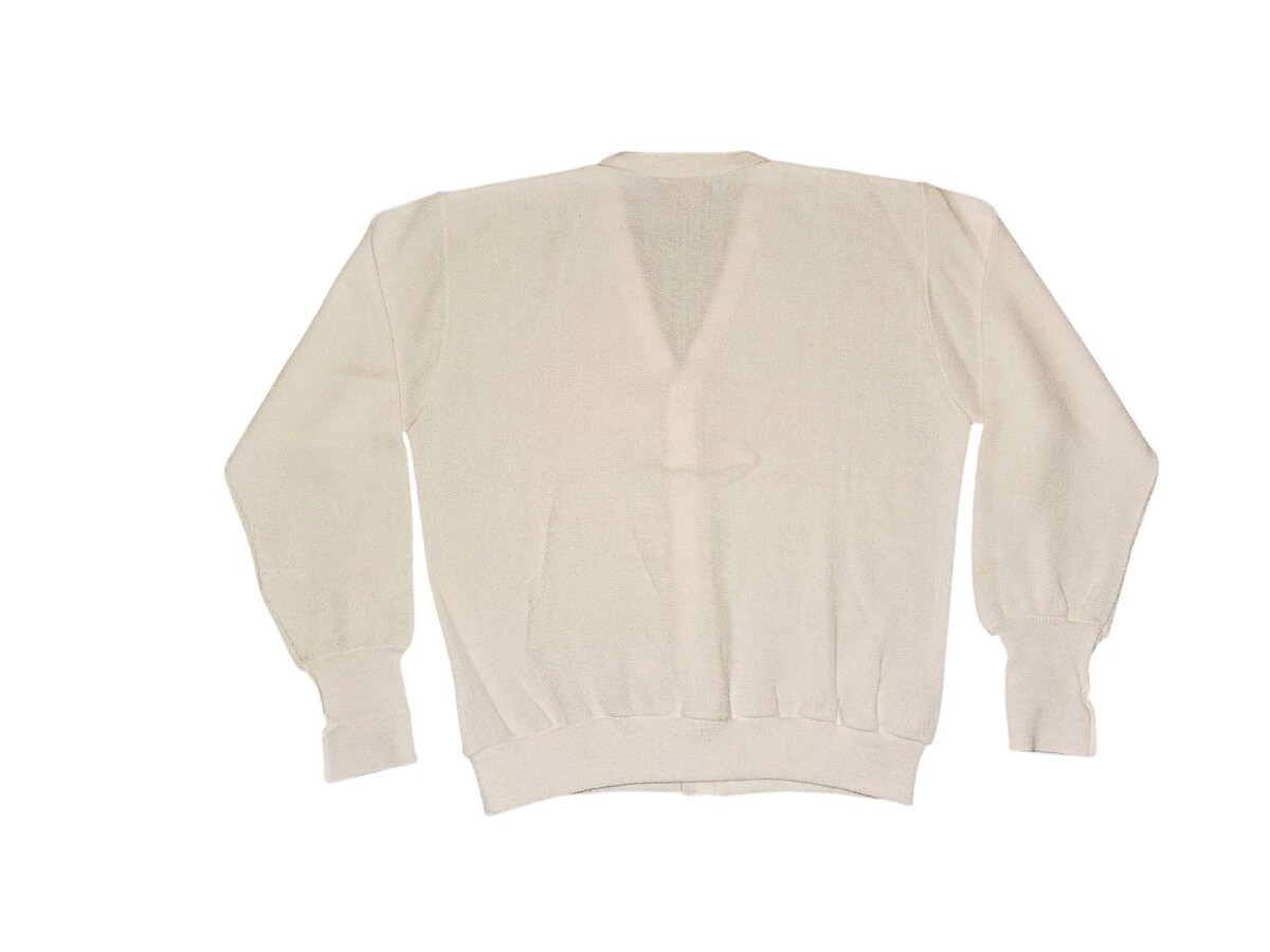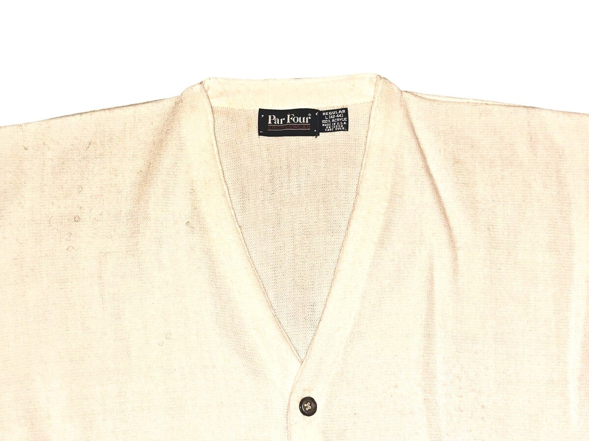 The product is a vintage-style Par Four men's sportswear cardigan in an off-white color. This oversized sweater in size L is made of acrylic knit fabric with long sleeves and button accents. Perfect for all seasons, this cardigan has a solid pattern and a vintage theme, ideal for those looking to add a touch of retro style to their wardrobe.