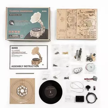 Vintage Classic Design This gramophone is a perfectly designed DIY puzzle wooden craft kit that can play vinyl records in real life.