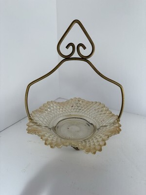 The Vintage Crystal Relish Server with Carrier Stand is a stylish toleware piece designed for serving relish or other condiments during meals. This elegant server features a crystal design on a toleware base, adding a touch of vintage charm to any dining table. The included carrier stand provides stability and makes it easy to transport the server to the table or storage area. Perfect for collectors or those looking to add a unique and decorative piece to their kitchen or dining room.