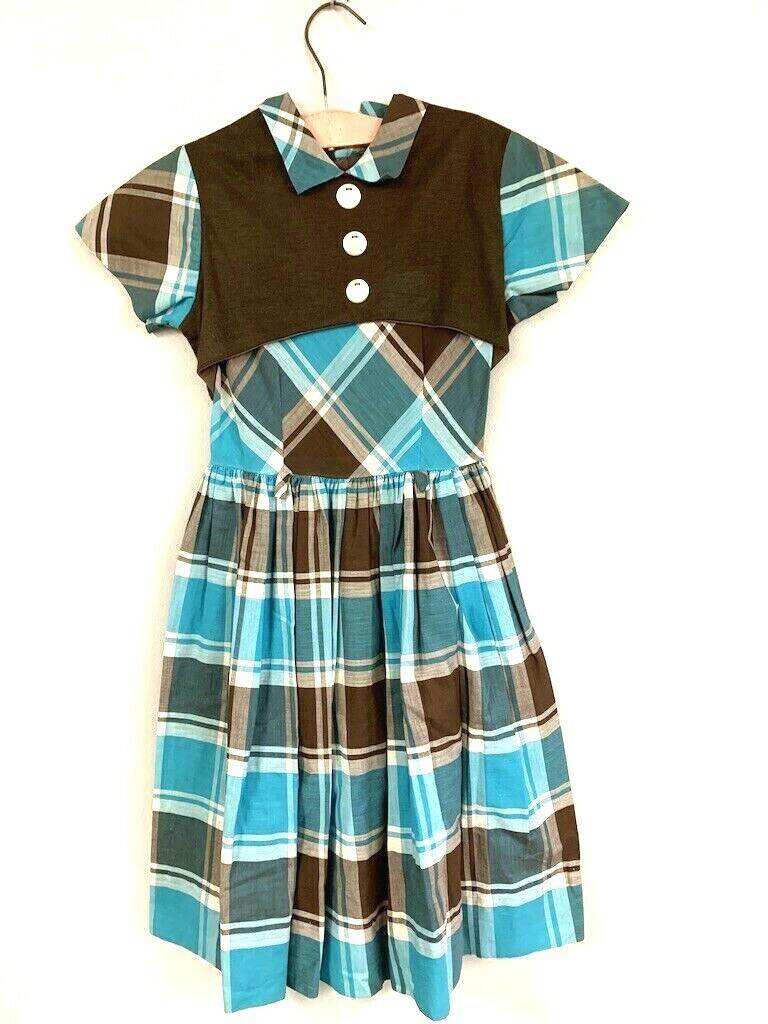 VTG 50s Cinderella’s Coach Plaid Girl’s Dress Brown Aqua White Vest Detail Sz