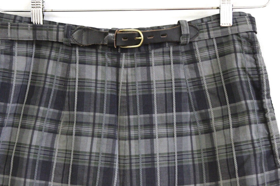 Adorable vintage 1950s women?s high-waisted Bermuda shorts by Queen Casuals, in gray plaid cotton. Features a side metal zipper, right-side inseam pocket, and original matching belt with a leather front panel. Longer length makes them versatile for casual wear or retro styling.