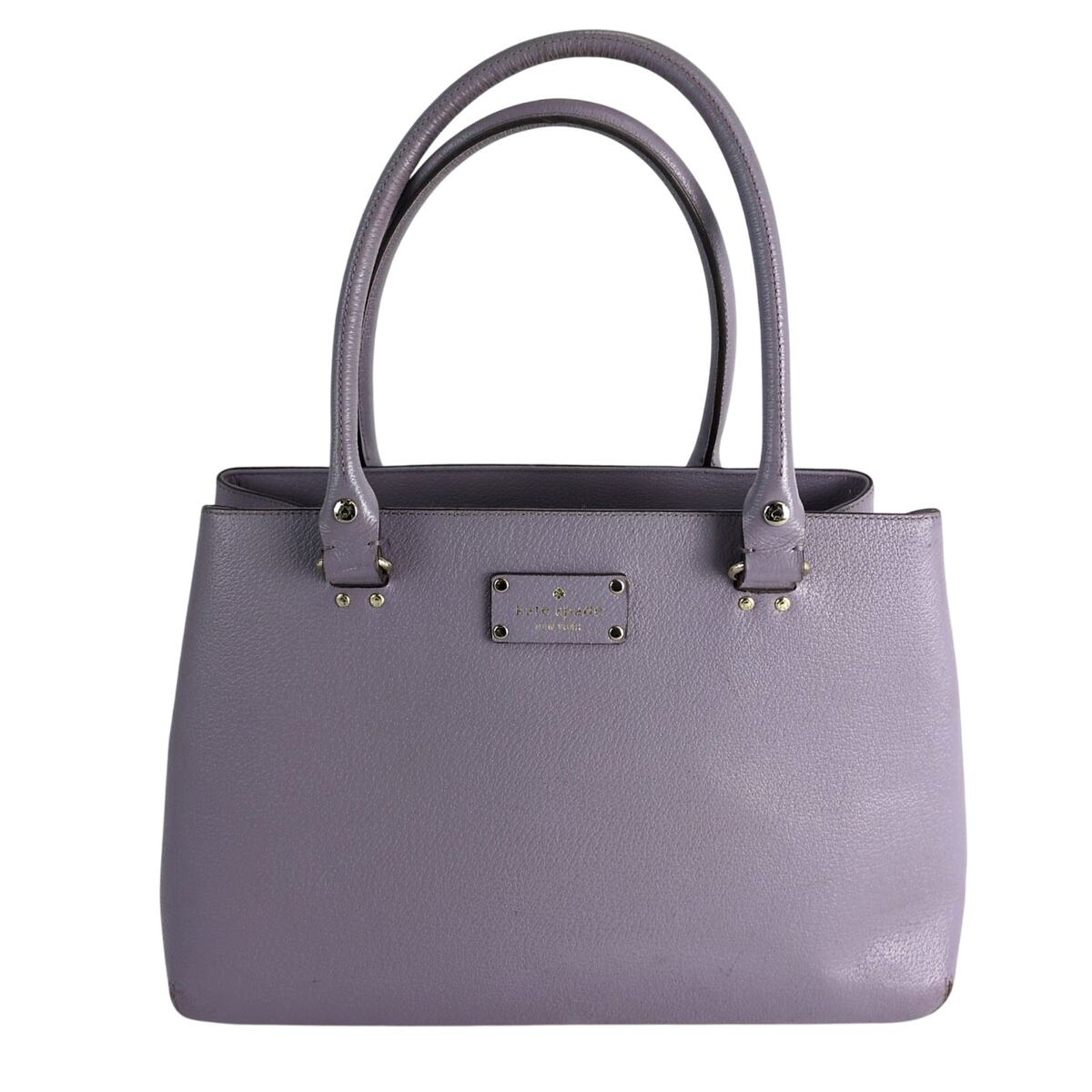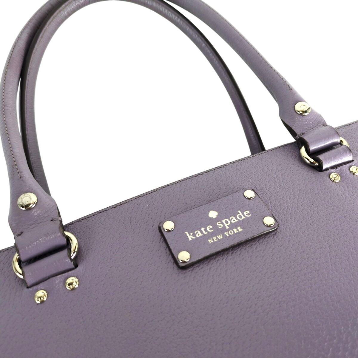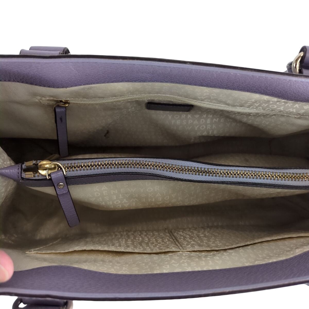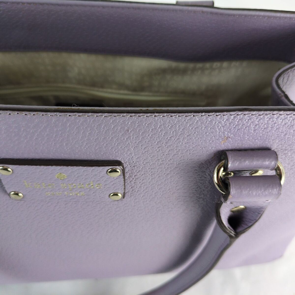 Features: Boarskin embossed cow leather in Lush Lilac purple, "Kate Spade New York" contrast polyester fabric lining in beige, silvertone hardware, Kate Spade New York logo patch inside and out, double handles, 3 inner compartments with center zipper, four feet on the base, originally retailed for $428.