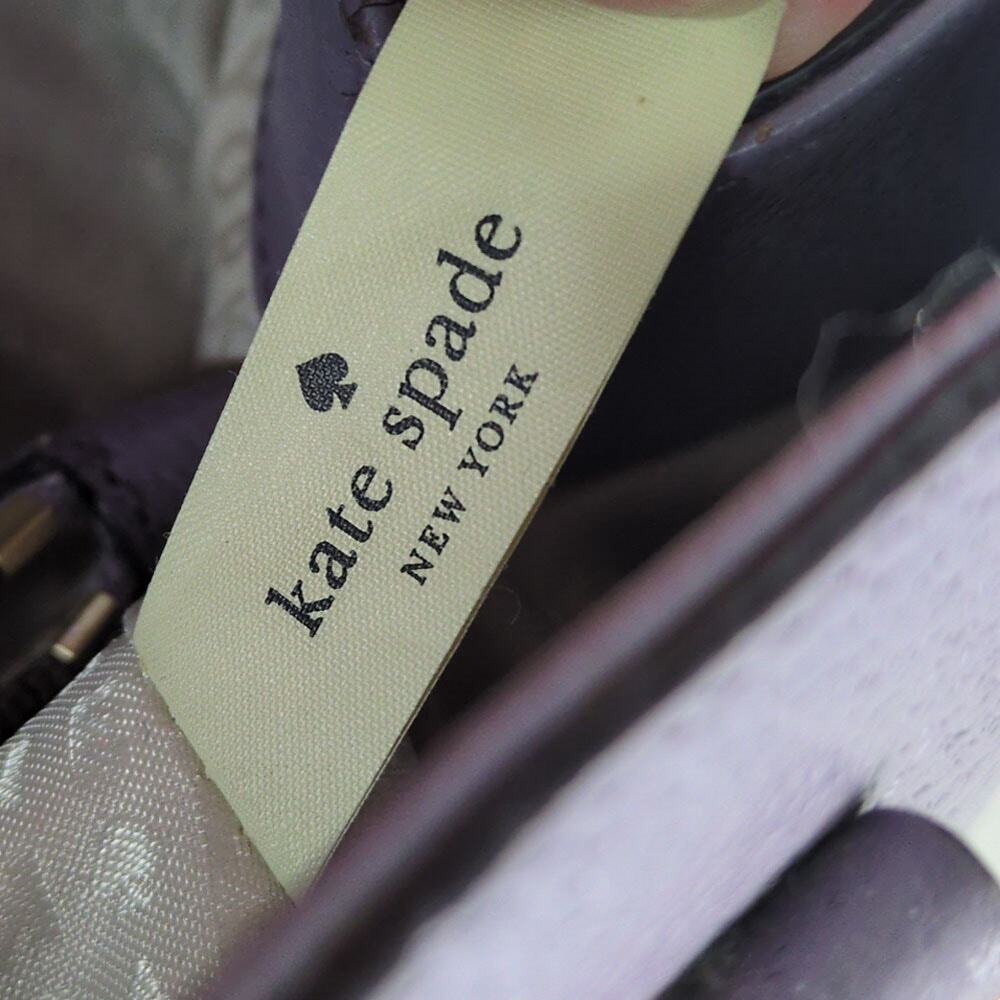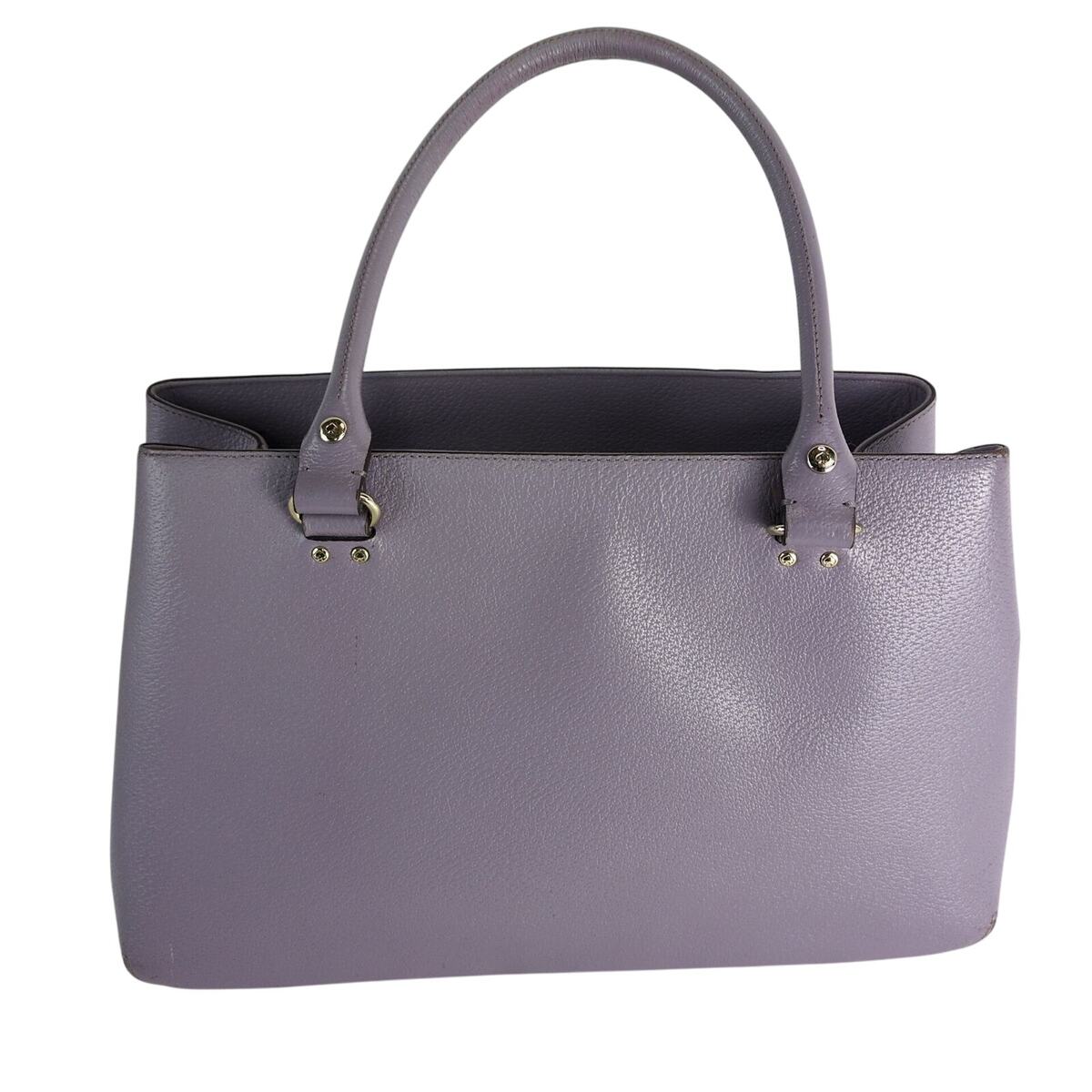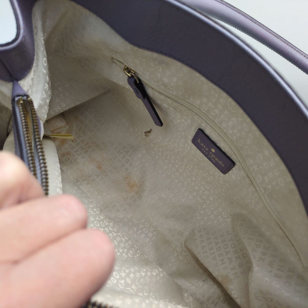 Features: Boarskin embossed cow leather in Lush Lilac purple, "Kate Spade New York" contrast polyester fabric lining in beige, silvertone hardware, Kate Spade New York logo patch inside and out, double handles, 3 inner compartments with center zipper, four feet on the base, originally retailed for $428.