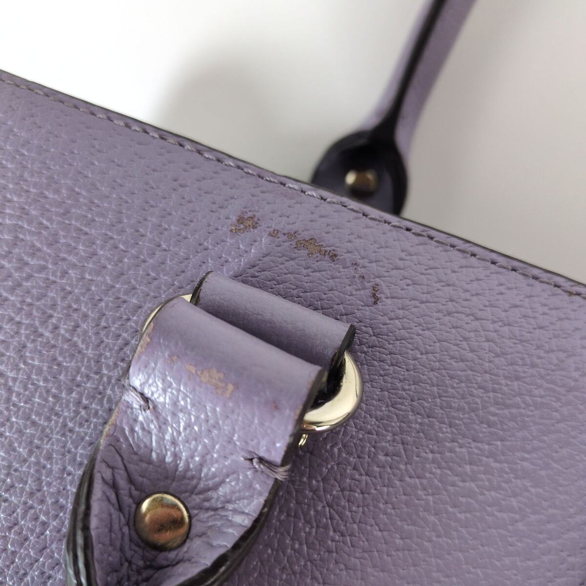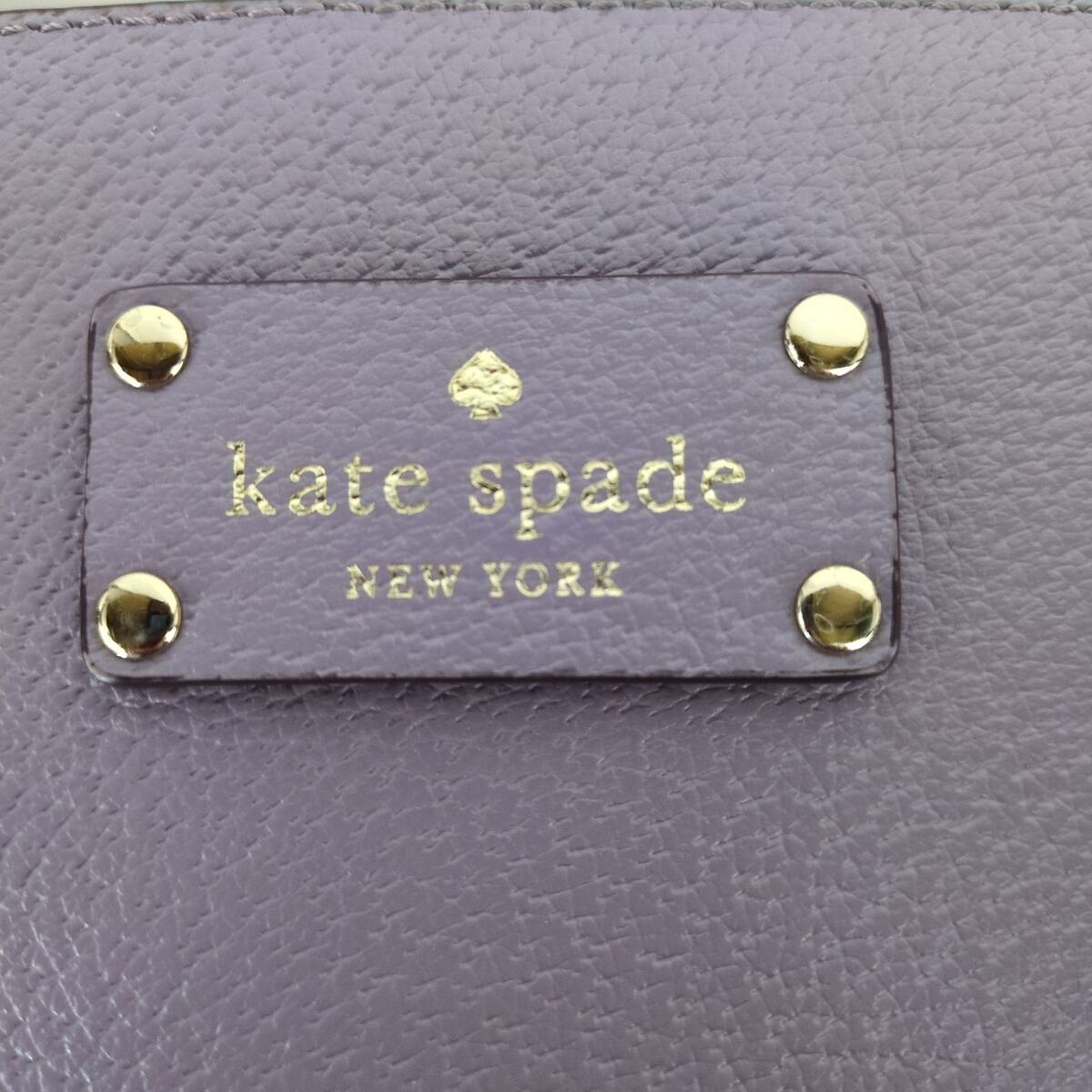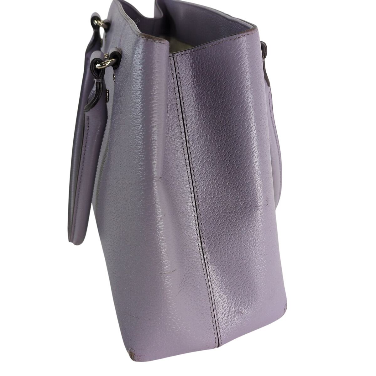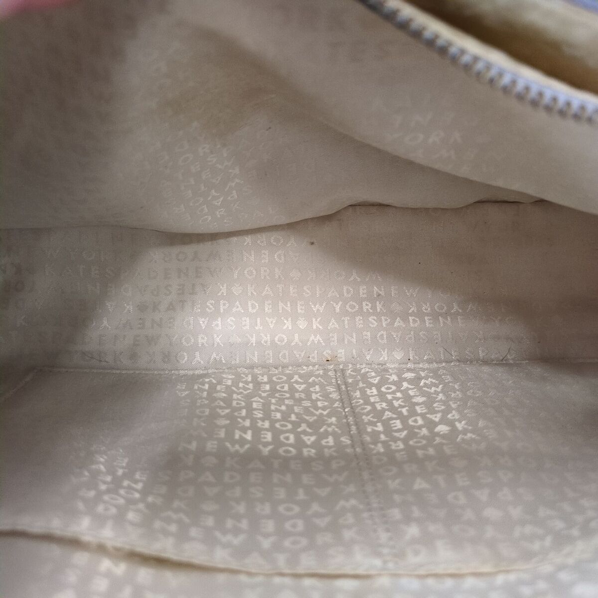 Features: Boarskin embossed cow leather in Lush Lilac purple, "Kate Spade New York" contrast polyester fabric lining in beige, silvertone hardware, Kate Spade New York logo patch inside and out, double handles, 3 inner compartments with center zipper, four feet on the base, originally retailed for $428.