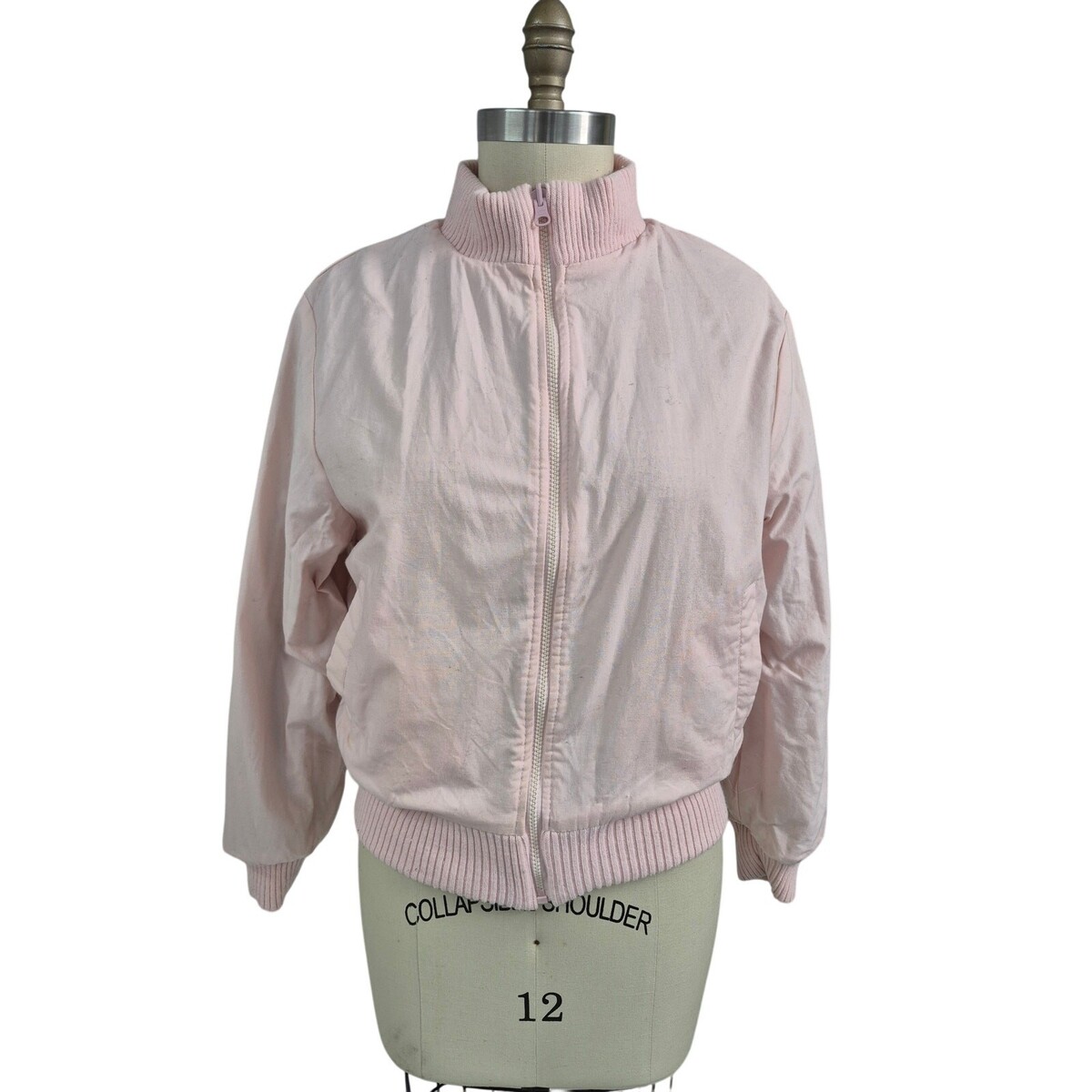 Vintage 1980s reversible knit jacket in pink and gray with intarsia patterning. Features an elastic waist and cuffs, front zip closure, and a versatile double-fabric construction?shell in acrylic/cotton, knit in acrylic. Can be worn on either side for two looks in one.