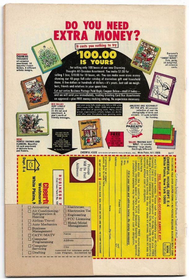 Description: Original cover price: 0.25. Cover Art by Dan DeCarlo; Art by Stan Goldberg Dan DeCarlo; Stories by Frank Doyle. 'The Brush Off': Alex's father hires Alan M to paint the walls of a room in his house. Alex fires him and his father makes him paint the wall for free. 'Puddle Muddle': Li'l Jinx gets a new pair of boots so she doesn't ruin her shoes by jumping in puddles. 'Friends to the End': Melody is worried that Alexandra won't loan her money for a new outfit for the big dance. 'It's Amazing': Alexandra tries using a love potion on Alan M and a dog ends up falling in love with her instead. 'Ski and See': Alexandra gets a winter tan to impress the professional skiers. 'Stop the Music': Alex gives directions to Alan M to the drink stand using beautiful girl landmarks, The Pussycats play a gig. 48 pages, Full Color. 110625-110625T