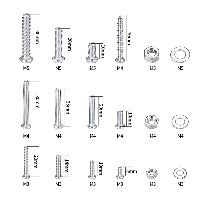Easy to Store: All M3 M4 M5 cross pan head machine screws and bolts and nuts and washers are stored in a separate girds plastic storage box, easy to store, use, carry, and get it, perfect to replace broken and missing screws.