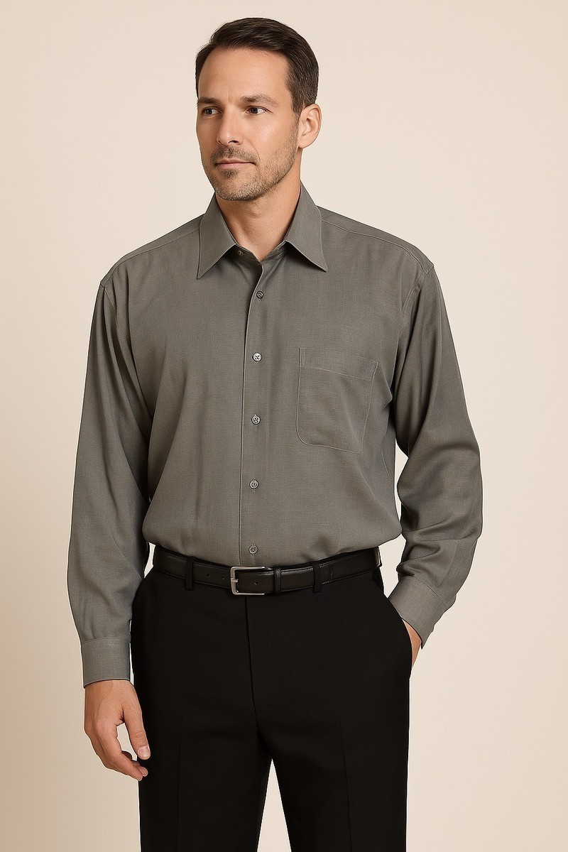Elegant Italian-made dress shirt by Vito Rufolo Uomo Couture, crafted from 100% long-staple cotton. The fabric has a refined taupe tone?a balanced blend of gray and brown?with a subtle sheen. Features a button-down collar, single chest pocket, and hidden placket for a smooth, tailored appearance. Perfect for business, formal occasions, or refined casual wear.