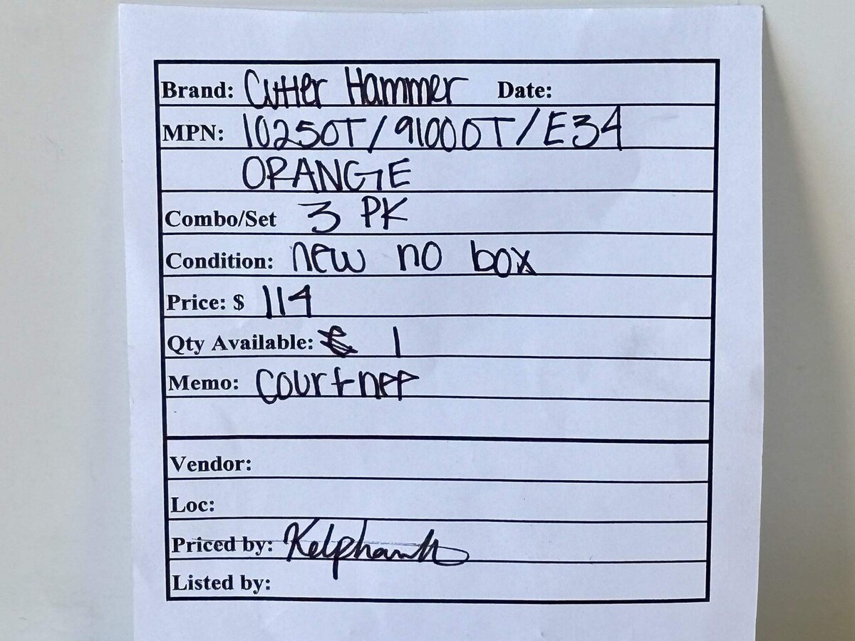 3PK Cutler?Hammer 10250T/91000T/E34 Heavy?Duty Orange 30.5 mm Pushbutton Operator New - No Box The Cutler?Hammer 10250T/91000T/E34 is an orange, 30.5 mm heavy?duty pushbutton operator designed for industrial control stations. It features a durable metal bezel and rugged housing rated for watertight and oiltight applications. The unit supports standard panel mounting with a 30.5 mm cut?out and accepts modular contact blocks and indicator units. Its bright orange actuator ensures high visibility for emergency stop or system status functions. Ideal for heavy?duty environments, it offers reliable performance in demanding industrial installations. Listed by: Maksim (Sales Team) ?Don?t dream of winning, train for it!?~ Mo Farah (A positive moment brought to you by Help Resale) About Us Welcome to Help Resale, your go-to consignment shop where value meets quality. At Help Resale, we're dedicated to providing you with an exceptional shopping experience, whether you're looking to find the best deals or consign your items. Need to buy a product, but don't see it in our store? Please feel free to reach out to us and we will help you find it! Help Resale 7200 Fair Oaks Blvd Suite 120 Carmichael CA 95608 Business Hours: Monday-Friday: 9:00 am to 5:00 pm (PST) All product and company names are trademarks TM or registered trademarks of their respective holders. Use of them does not imply any affiliation with or endorsement by them.