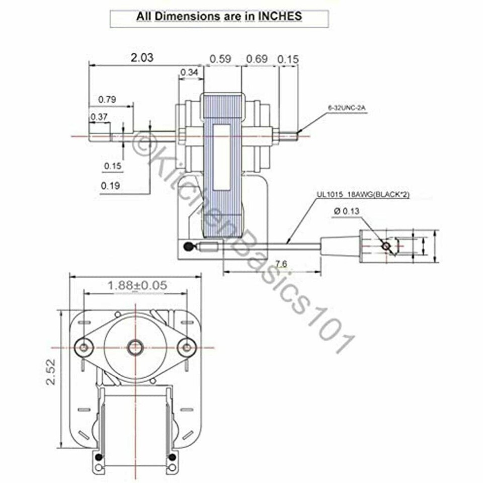 Shaft = 3/16" X 1 3/4", wire length = 6" With 2-prong plug. Mounting studs 1 7/8" On center.