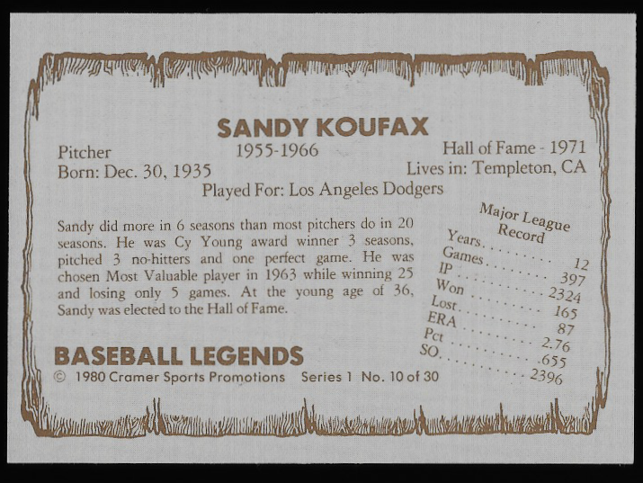 Sandy Koufax autograph signed 1980 Baseball Legends card #10 Dodgers