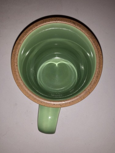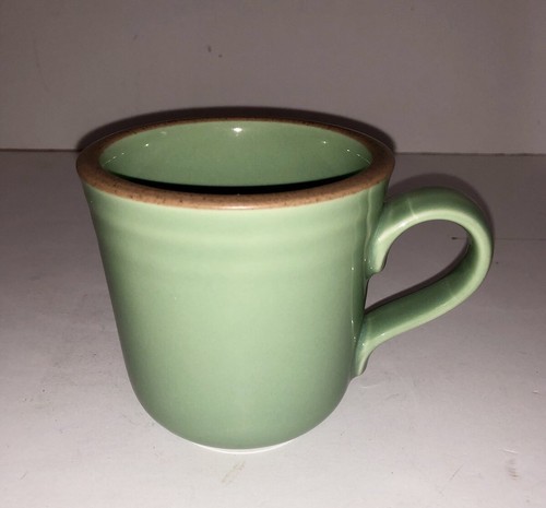 This vintage Noritake Madera Sea Foam stoneware coffee cup/mug is a great addition to any kitchen. The mug has a solid color pattern that is green and a brown rim, and can hold up to 10 fl oz of your favorite beverage. It is made of durable stoneware and is microwave, dishwasher, and oven-safe.