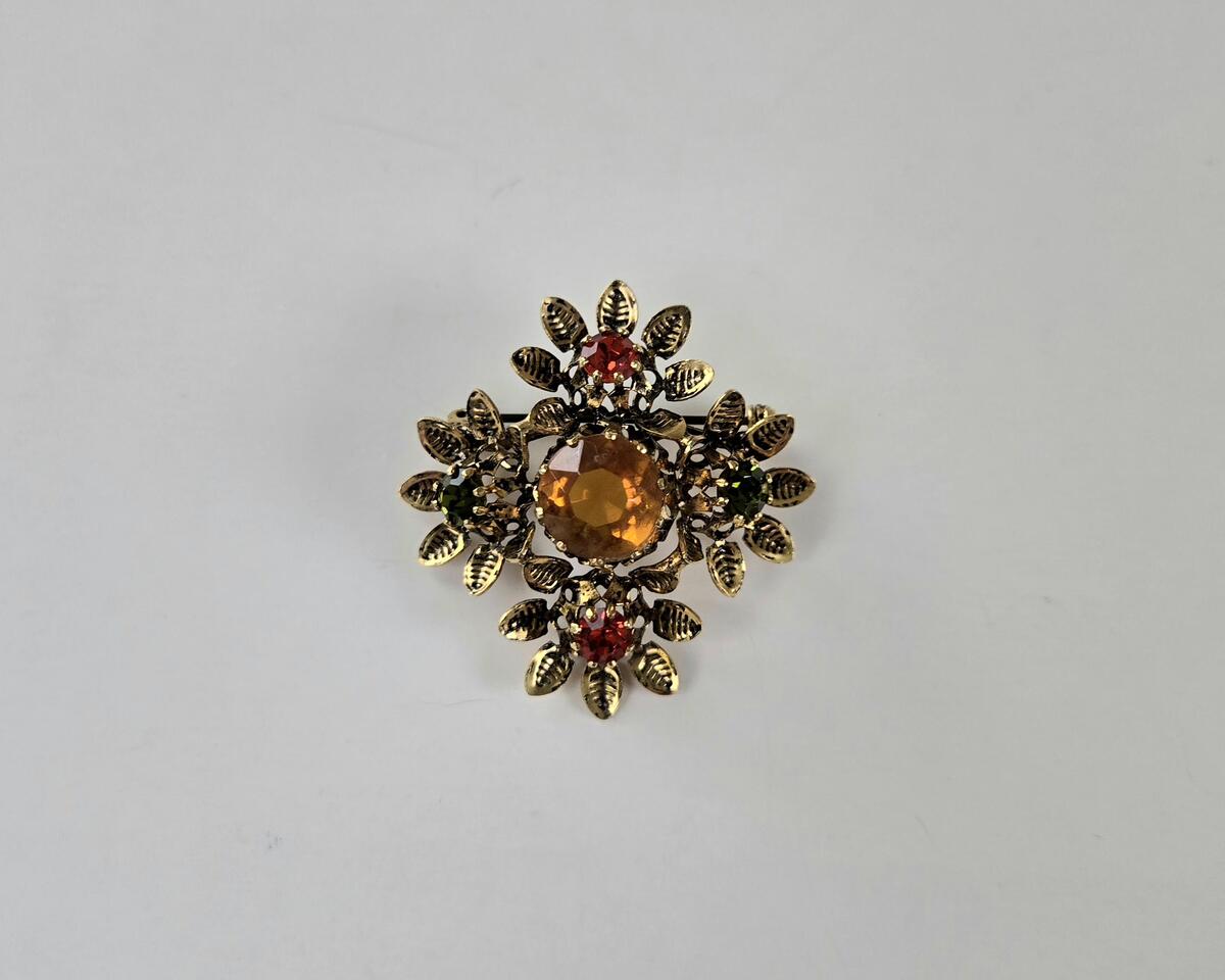 Amber, Orange & Green Gold Vintage 1950s Made in Austria Floral Brooch Pin