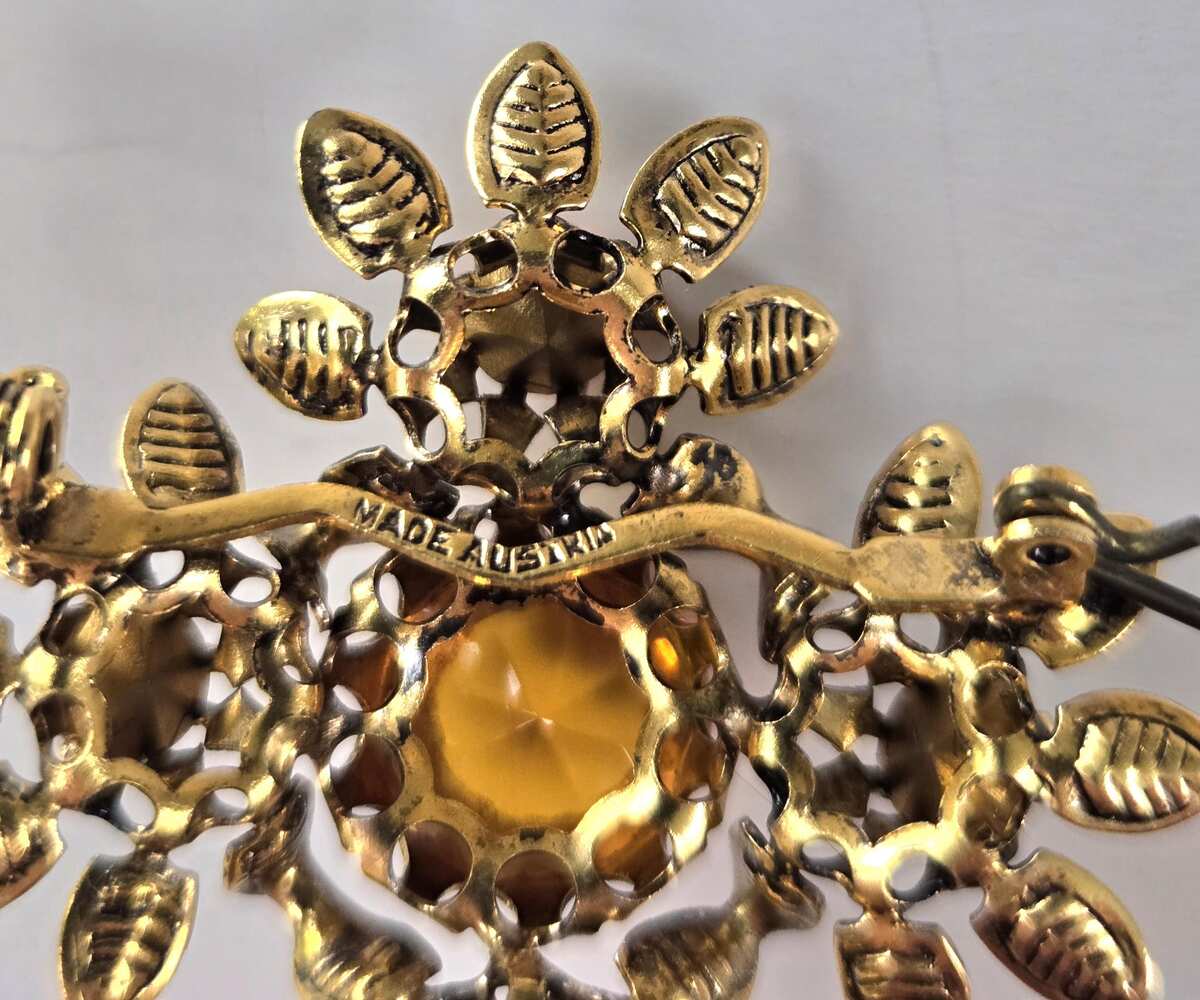 ?Style/Features: Terrific example of Viennese mid-century craftmanship. Four flowers hand soldered together at the tips of the leaves in an antiqued technique finished with sparkling Austrian crystals. A petite 1.50 inches in diameter the fiery crystals in this Made Austria brooch is exceptional. Perfect fall colors in like new setting, straight pin sparkles like real citrines amber. Time capsule of mid-century glamour. Ships in a crisp box for gifting.