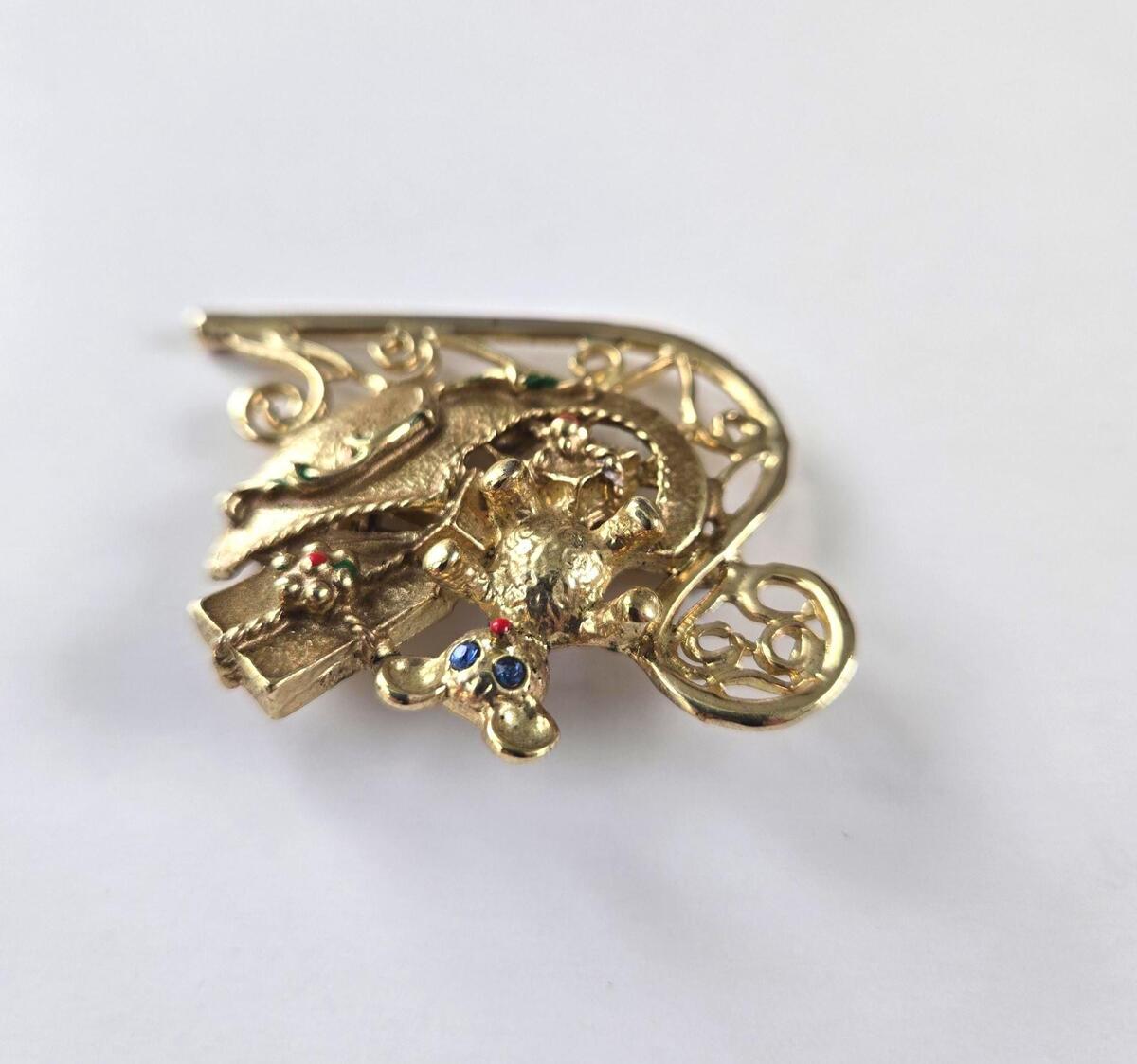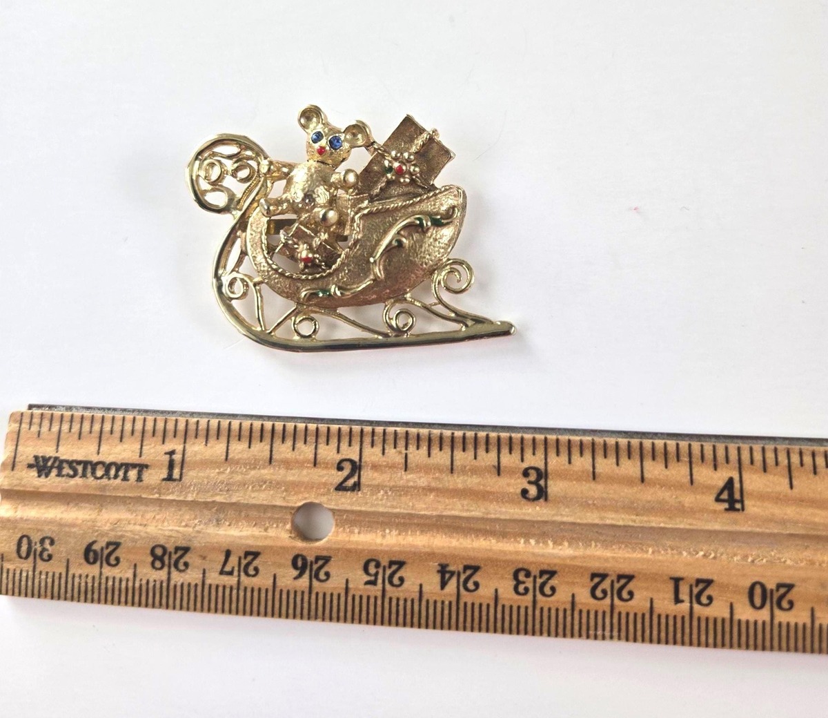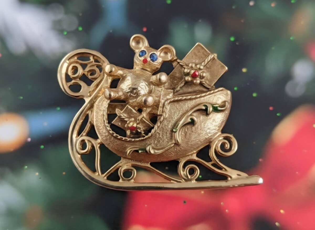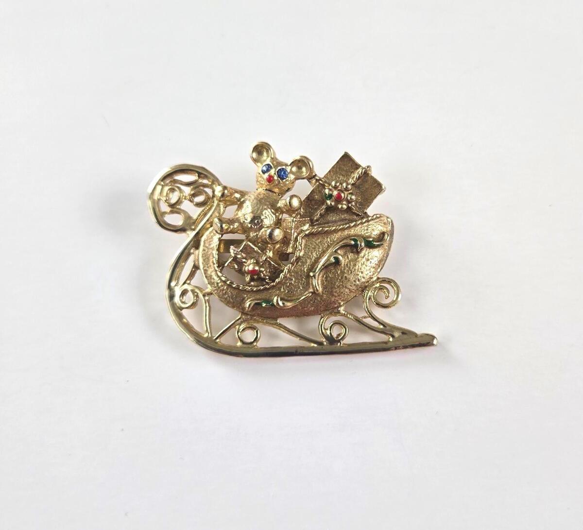 ?Style/Features: Fly into the holidays in style. This vintage gold Santa's sleigh brooch features a classic fun design finished in gold with small red and green enamel bits and blue rhinestone eyes. In the sleigh is a mouse and gifts waiting to be delivered on Christmas Eve. Whether gifting or treating yourself this ships in a crisp white box ready for a bow.
