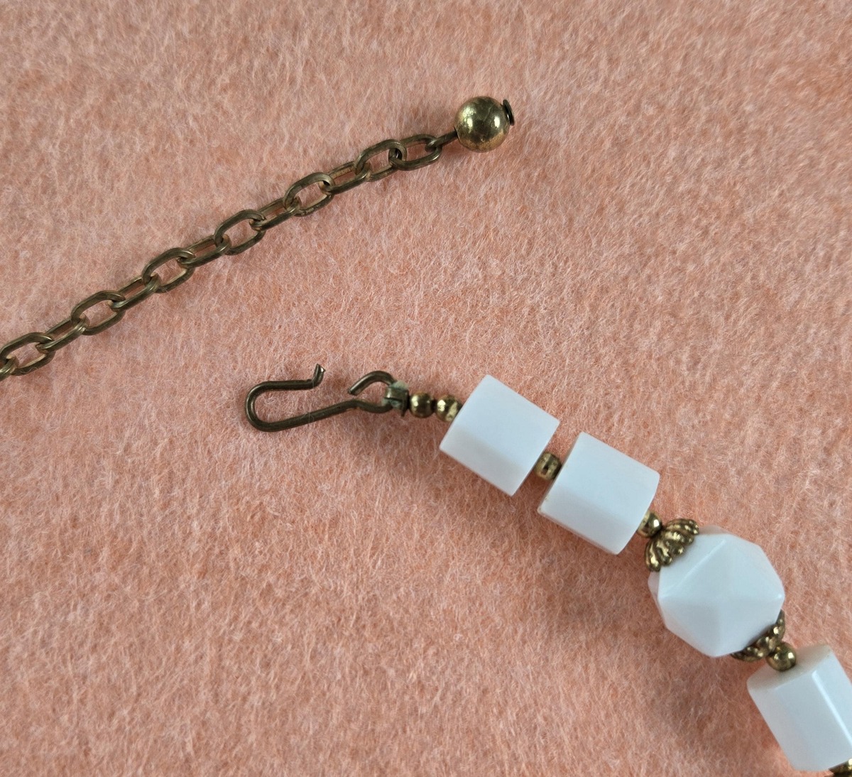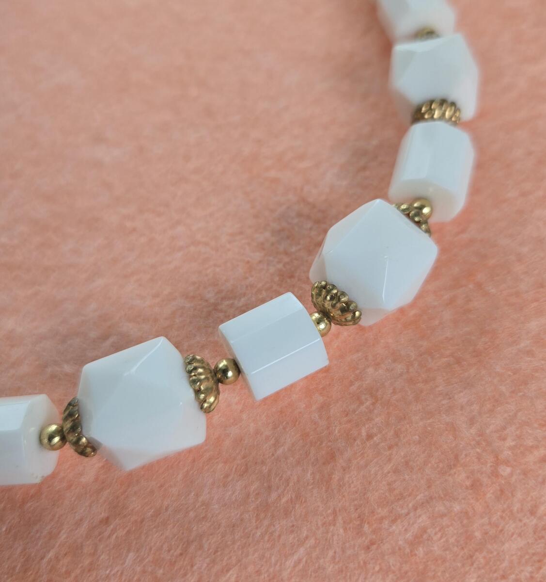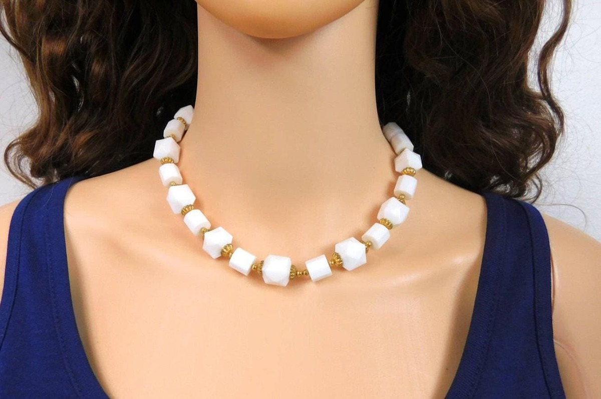 ?Style/Features: Perfect white choker with unique square lucite beads. Lightweight for all day or night wear.