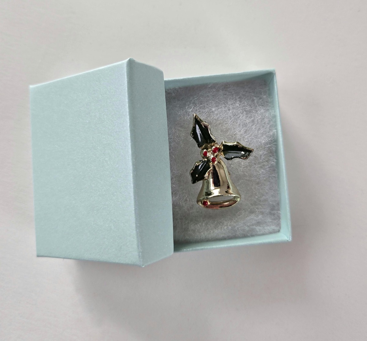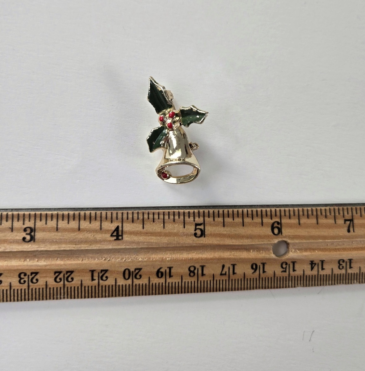 Small Christmas Bell & Holly Brooch | Low Profile Holiday Pin Work Jewelry