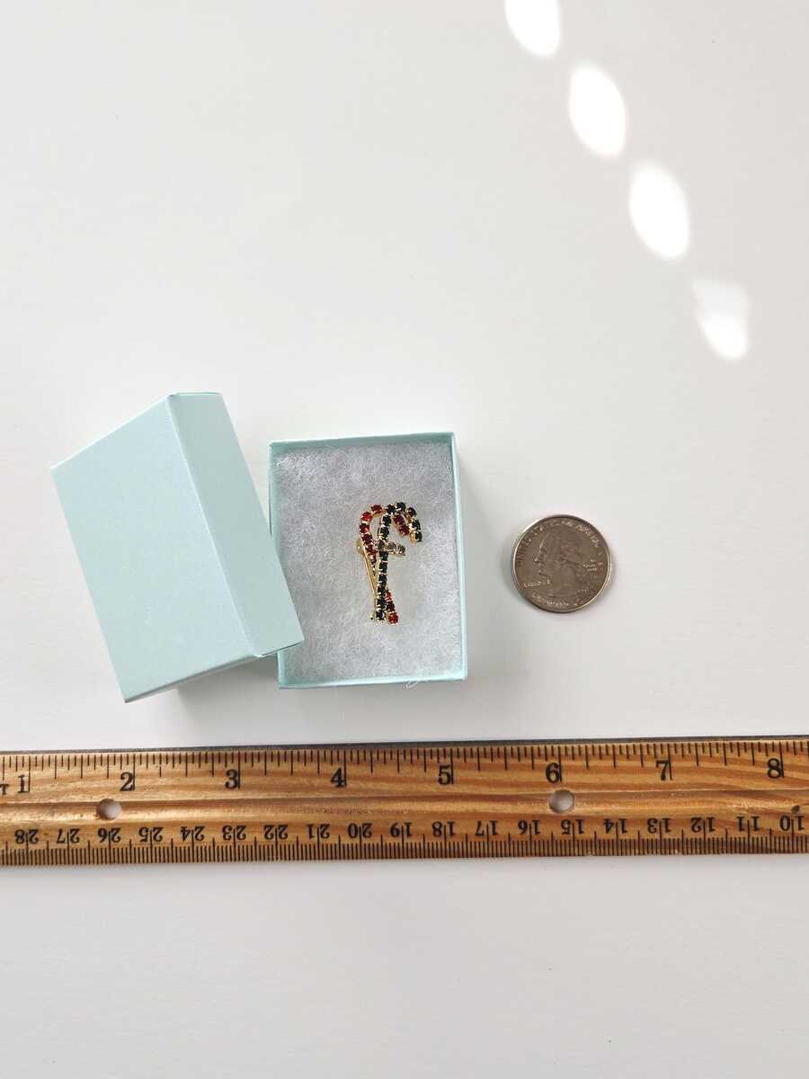 ?Style/Features: Charming vintage candy cane pin is the perfect subtle accent for the holiday season. At a daily size of just 1 inch tall it features two miniature canes, one glittering in red and one in green, beautifully crafted in warm gold tone setting. A tiny cluster of blue rhinestones adds an unexpected pop of festive contrast. It's small size makes it the ideal lapel accent, cute addition to a collar or a thoughtful easy stocking stuffer. Ships in a small pale blue box ready for gifting that will fit in any stocking.