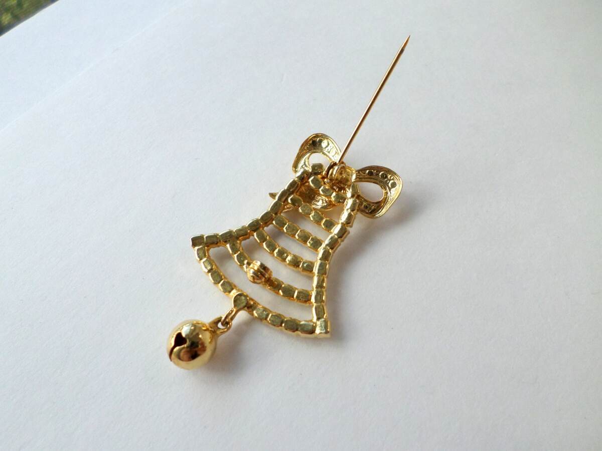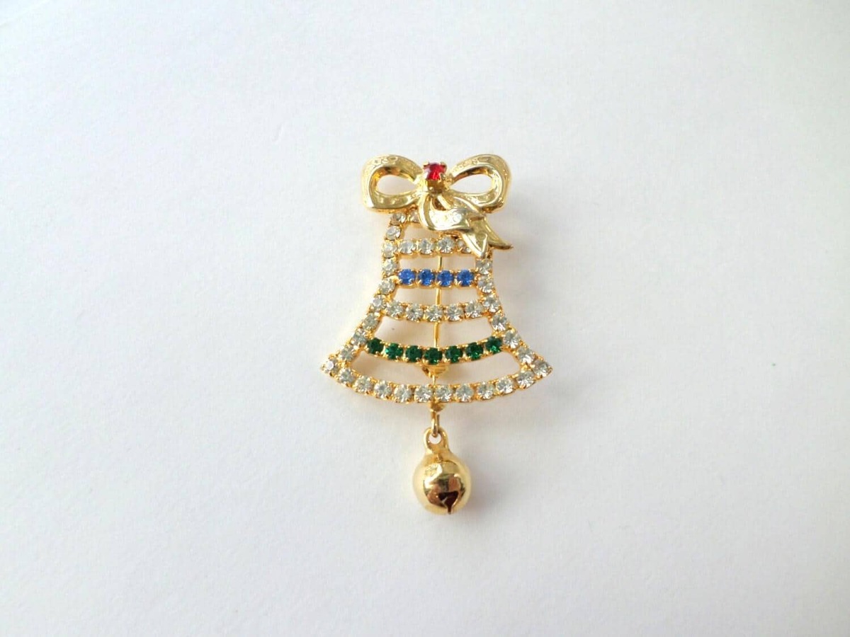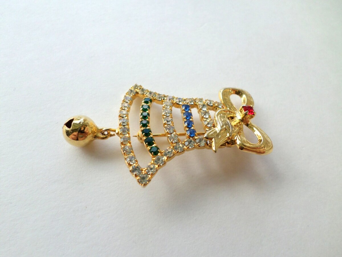 ?Style/Features: Adorn your favorite festive outfit with this sparkling vintage Christmas bell brooch. Featuring a beautiful array of perfect green, brilliant blue and deep red rhinestones set in a shining gold tone setting. This eye catching holiday pin is the perfect accessory to celebrate the season. Makes a classic modern addition to cozy winter sweaters, party dress or lapel. Whether you're a collector of unique Christmas jewelry or searching for a holiday or stocking stuffer gift this rhinestone bell pin brings a retro glamour and cheery seasonal sparkle to any look. Ships in a crisp box ready for a bow.
