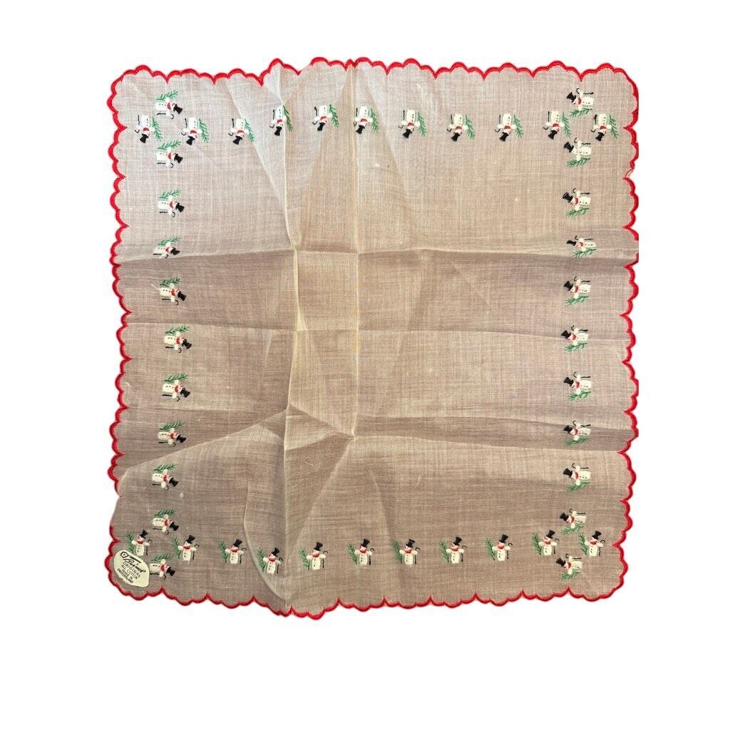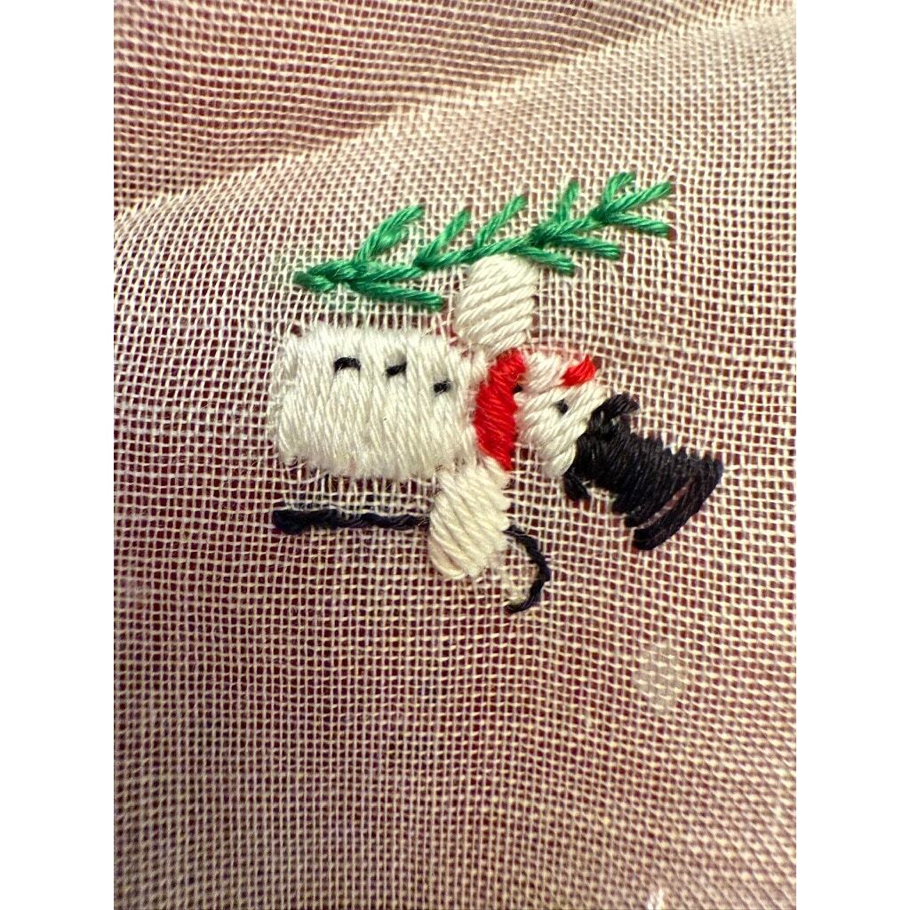 Great new/old vintage hankie from Burmel, unused with original sticker, sheer white cotton with embroidered snowman and red hand-rolled edges, 13 x 13". Great gift!