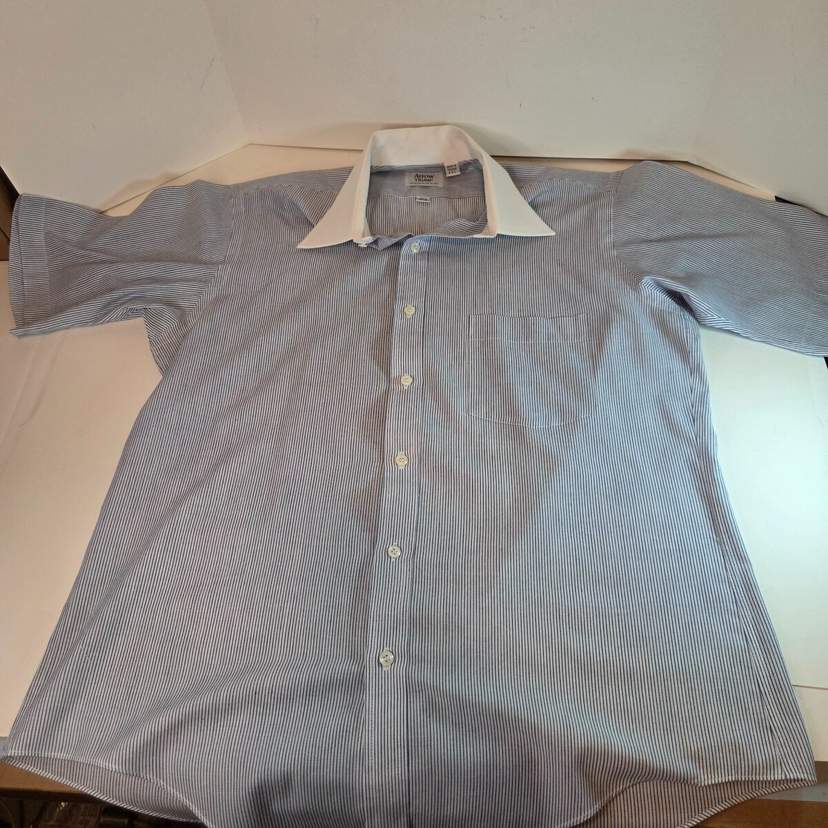Classic Arrow Trump men?s short sleeve dress shirt featuring a blue pinstripe pattern with a contrasting white club collar. Made in Taiwan R.O.C., this vintage piece blends retro charm with timeless style.
