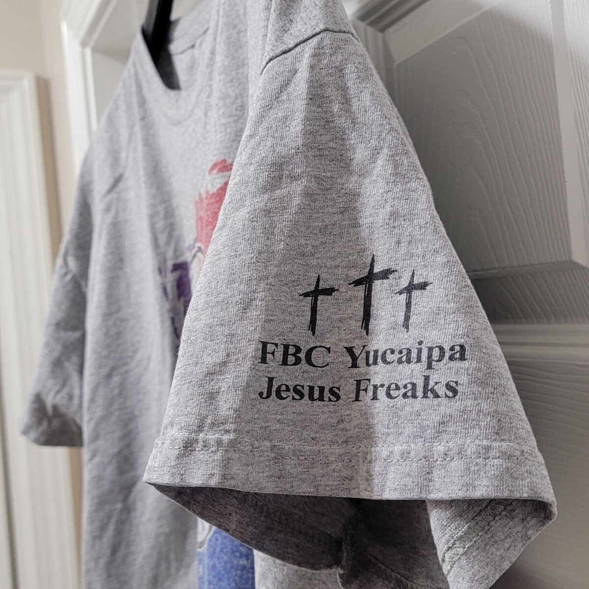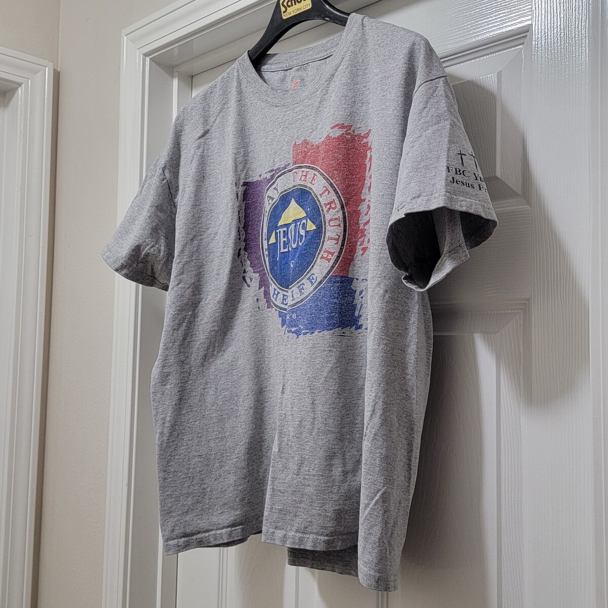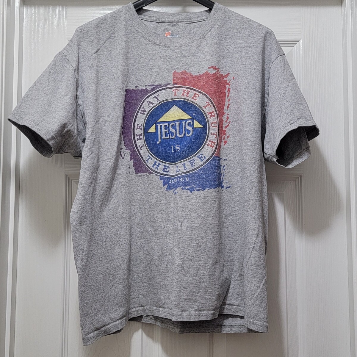 Vintage 1999 Hanes Authentic John 14:6 Jesus Is The Way - The Truth - The Life - FBC Yucaipa Jesus Freaks (on sleeve) Gray T-Shirt. Men's Size L. Actual measurements: 47" chest, 26.5" length. Great pre-owned Condition.