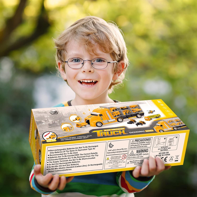 Imagination game: Construction truck toys set can fully stimulate for 3-5,5-7year old boy imagination, hands-on ability, and fully develop their left and right brains. hold down the car and gently push back, release your hand, and the car will run forward quickly.Under the stimulation of truck lighting and music, children can be completely immersed in their wonderful world, allowing parents to have a moment of Quiet time.