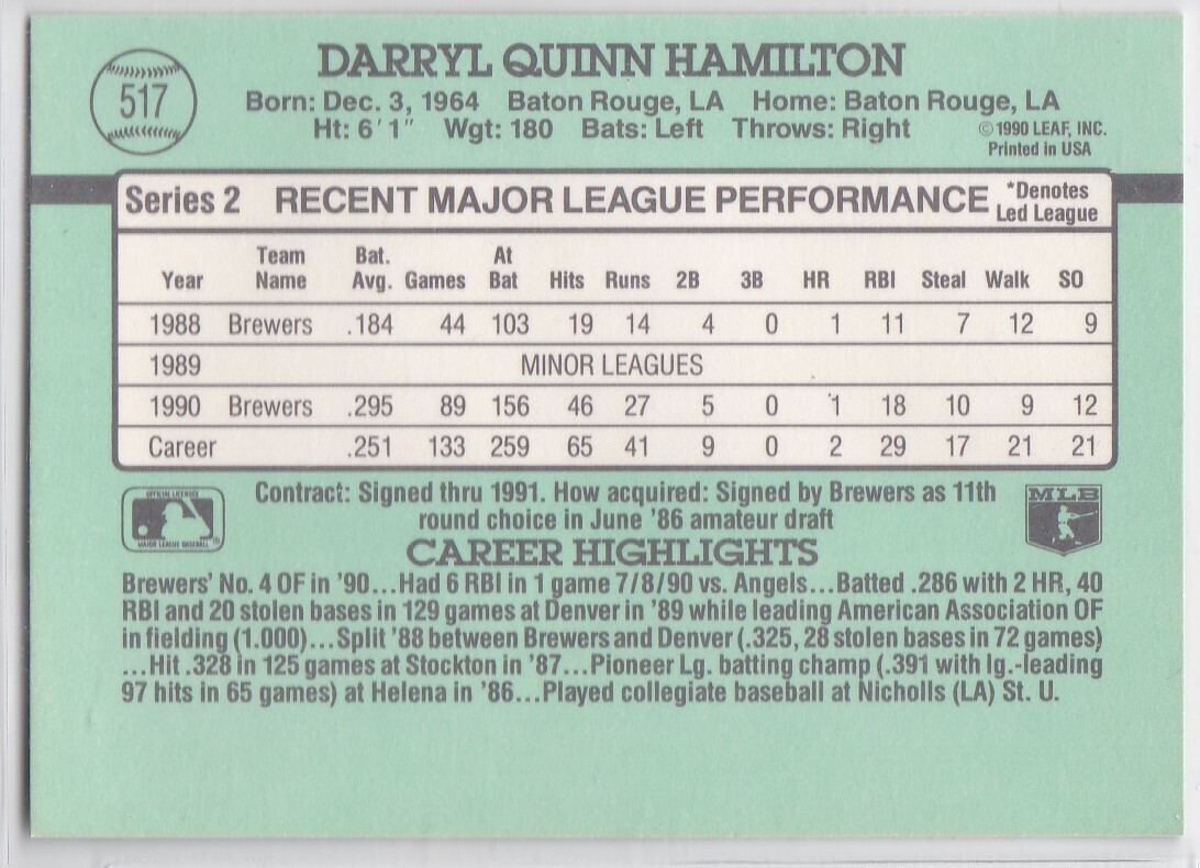 M) 1991 Donruss Baseball Trading Card - Darryl Hamilton #517