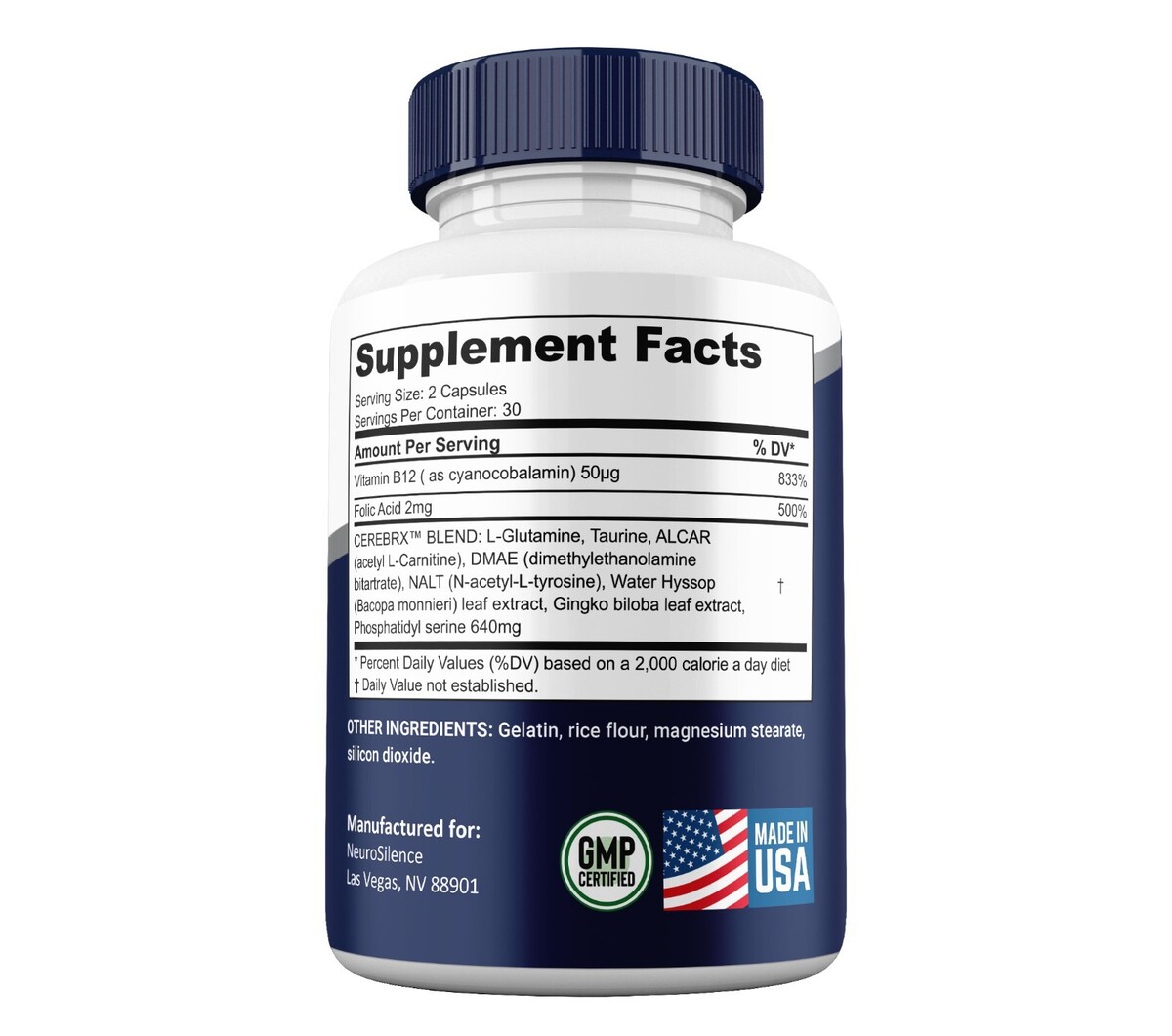 Neuro Silence Supplement is carefully designed, delivers 30 servings per bottle, offering a month of easy daily use. Simply take 2 capsules daily to keep your routine consistent and simple. These capsules are highly absorbable, convenient, and made in a certified facility with quality in mind. Designed to complement your day with calm focus, and a sense of balance in busy moments.