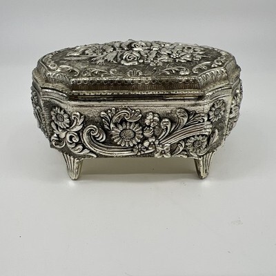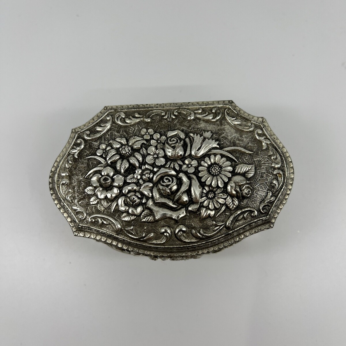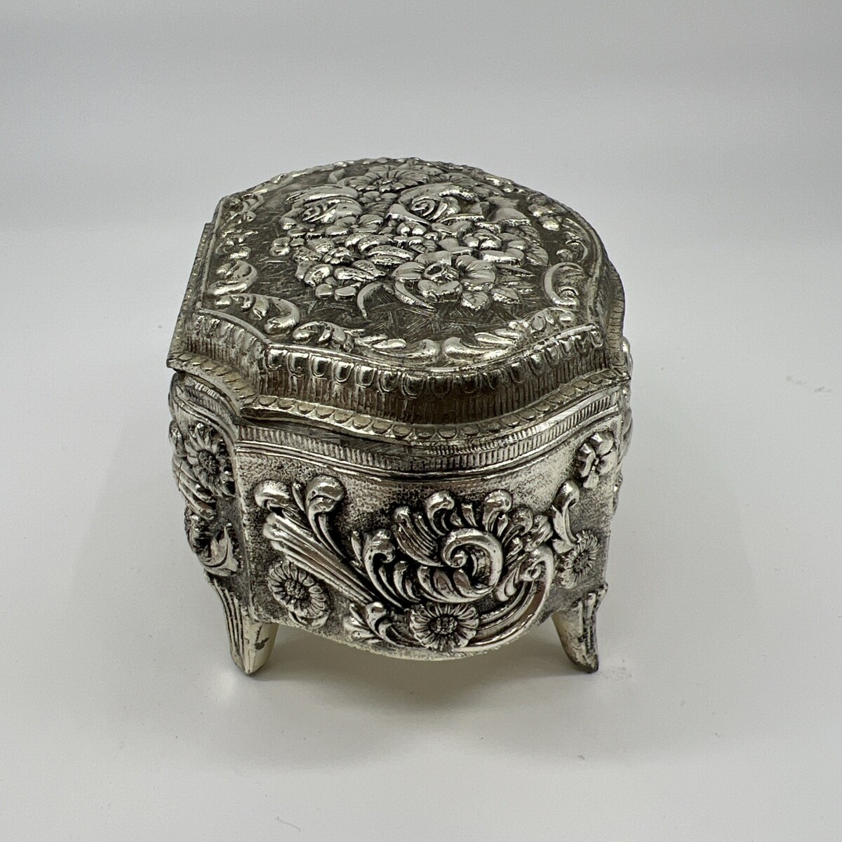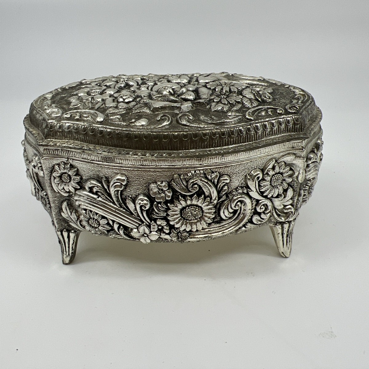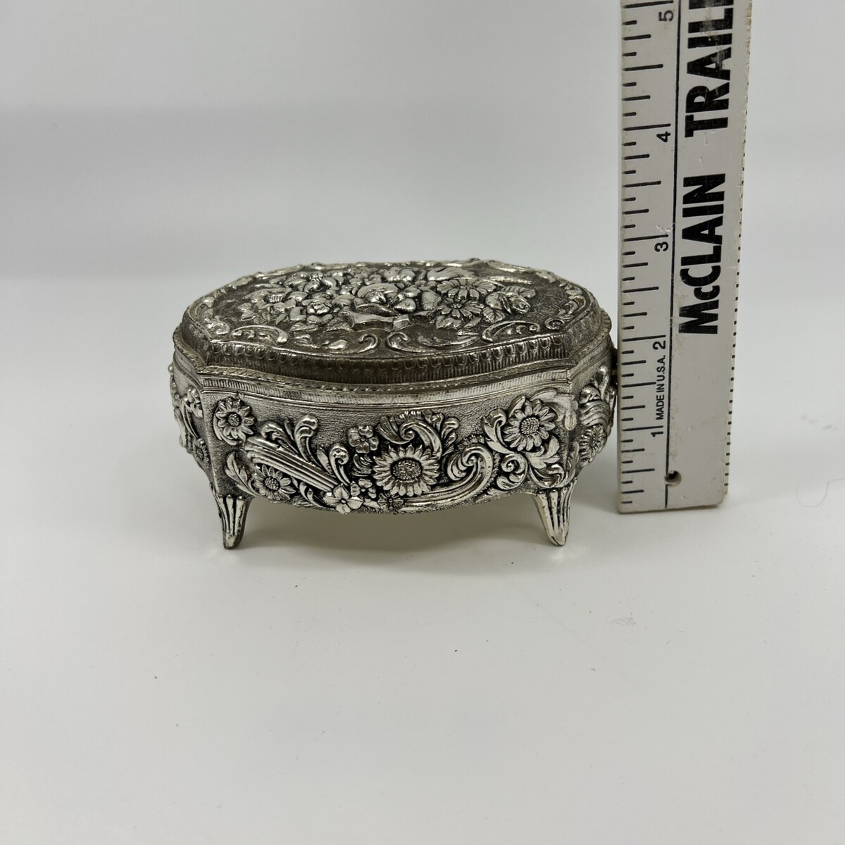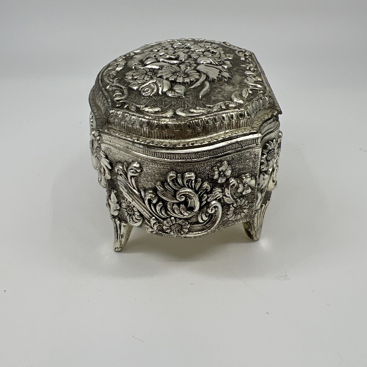 Vintage Silver Tone Floral Footed Jewelry Trinket Box Cottage Core Victorian