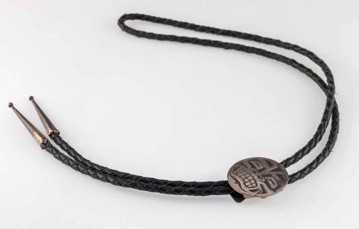 Corbata de bolo de mono nativo americano del noroeste de plata de ley con cuero trenzado