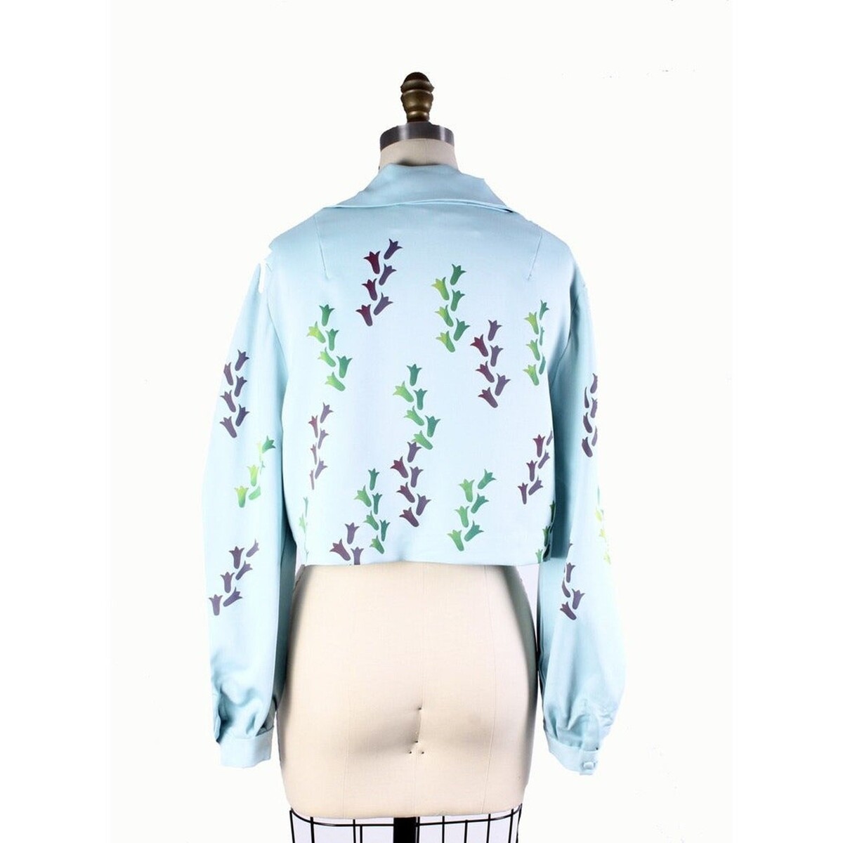 ?Tummey? was a short-run novelty fashion label in the 1970s, producing bold knitwear and blouses with unique hand-block-printed motifs. The oversized collar and graphic print perfectly embody the art-meets-fashion experimentation of the disco era. Few examples survive, making this blouse a true conversation starter and collector?s gem.