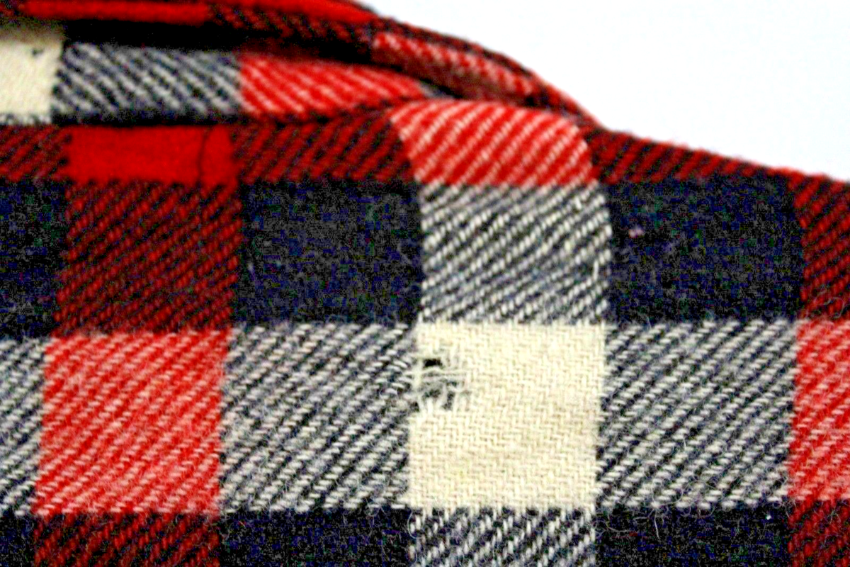 100% wool, red and black buffalo plaid, button front (buttons missing), two front pockets, black sheep label, Woolrich, 1940s?50s