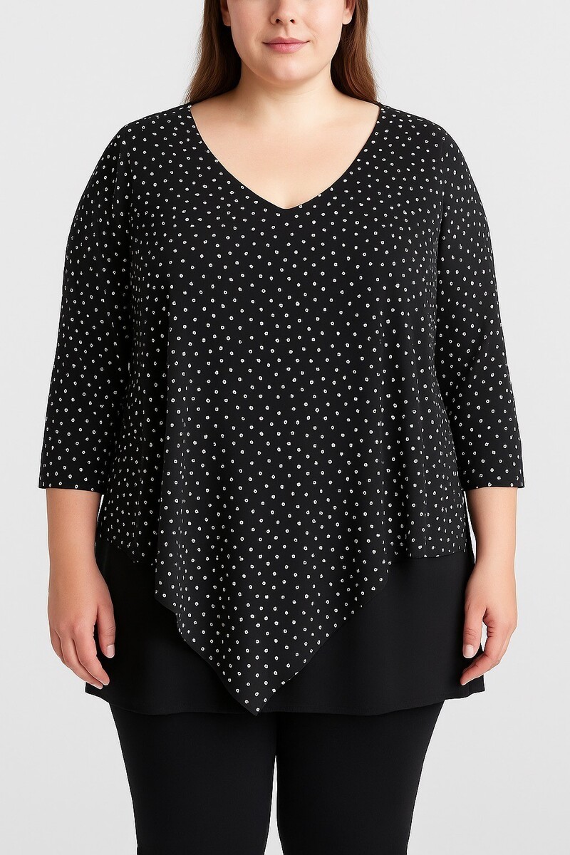 Chic and flattering black knit top by Shannon Ford New York featuring a layered asymmetrical chiffon overlay with a white polka dot pattern. The lightweight stretch knit fabric ensures comfort and movement, while the draped front adds a modern touch. Perfect for casual or dressy wear.