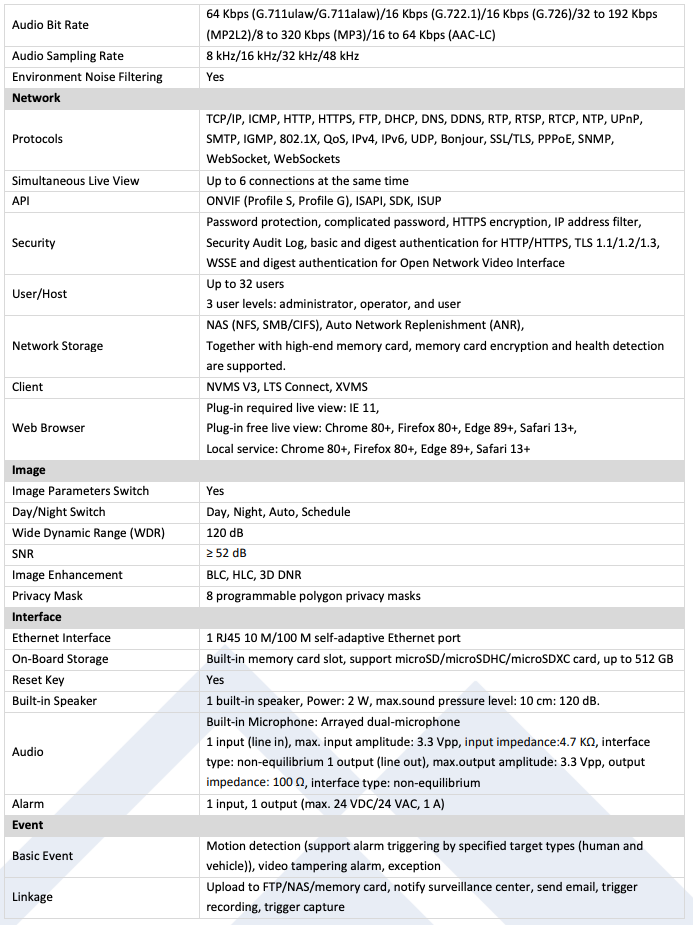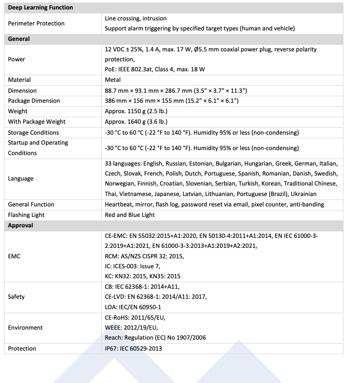 4MP camera with deep learning-based human and vehicle detection, smart hybrid light with IR and white LEDs, dual-array microphone, 120dB true WDR, H.265+ compression, IP67 protection.