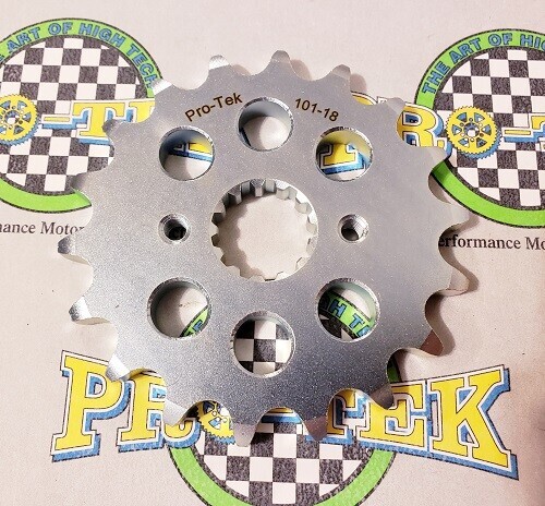 Pro-tek front sprockets are completely CNC machined to exact tolerances from 4140 nickel-chromoly steel resulting in a quality product. None of the Pro-tek front sprockets are gear hobbed, but are lightened with drilled holes to save on rotating mass. Every lb of rotating mass equates to a 4 lb weight reduction. The sprockets are then case hardened to Rc 58-60 and finished with a zinc plating for added durability and protection from corrosion. Made in the USA, normally retail for $34.95. This is for a 530 Pitch front sprocket 13, 14, 15, 16, 17 or 18 tooth.