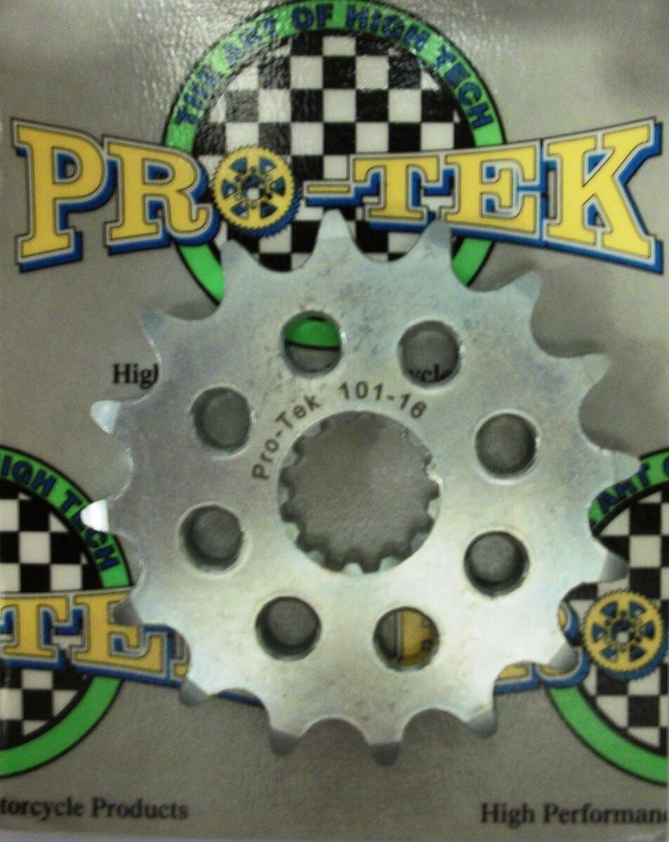 Pro-tek front sprockets are completely CNC machined to exact tolerances from 4140 nickel-chromoly steel resulting in a quality product. None of the Pro-tek front sprockets are gear hobbed, but are lightened with drilled holes to save on rotating mass. Every lb of rotating mass equates to a 4 lb weight reduction. The sprockets are then case hardened to Rc 58-60 and finished with a zinc plating for added durability and protection from corrosion. Made in the USA, normally retail for $34.95. This is for a 530 Pitch front sprocket 13, 14, 15, 16, 17 or 18 tooth.
