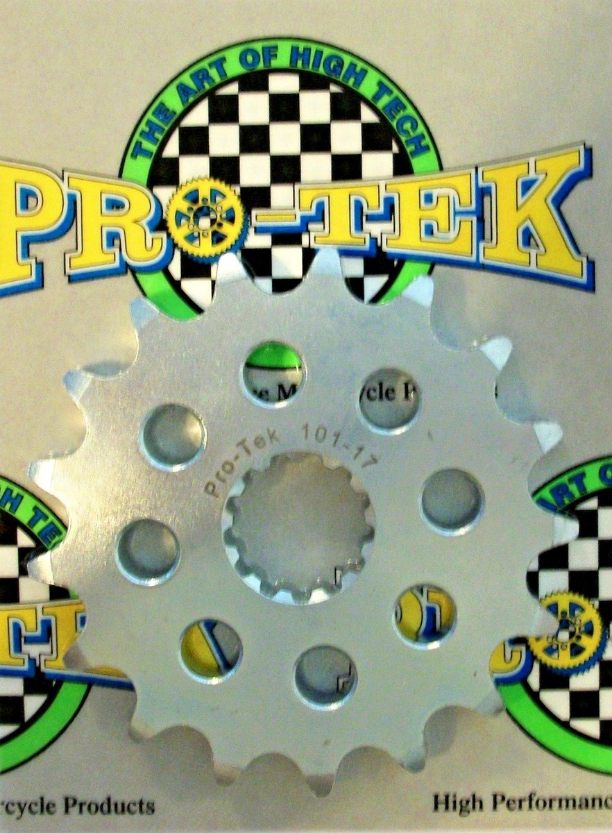 Pro-tek front sprockets are completely CNC machined to exact tolerances from 4140 nickel-chromoly steel resulting in a quality product. None of the Pro-tek front sprockets are gear hobbed, but are lightened with drilled holes to save on rotating mass. Every lb of rotating mass equates to a 4 lb weight reduction. The sprockets are then case hardened to Rc 58-60 and finished with a zinc plating for added durability and protection from corrosion. Made in the USA, normally retail for $34.95. This is for a 530 Pitch front sprocket 13, 14, 15, 16, 17 or 18 tooth.