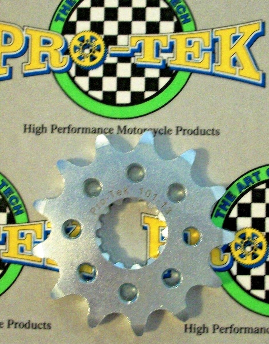 Pro-tek front sprockets are completely CNC machined to exact tolerances from 4140 nickel-chromoly steel resulting in a quality product. None of the Pro-tek front sprockets are gear hobbed, but are lightened with drilled holes to save on rotating mass. Every lb of rotating mass equates to a 4 lb weight reduction. The sprockets are then case hardened to Rc 58-60 and finished with a zinc plating for added durability and protection from corrosion. Made in the USA, normally retail for $34.95. This is for a 530 Pitch front sprocket 13, 14, 15, 16, 17 or 18 tooth.