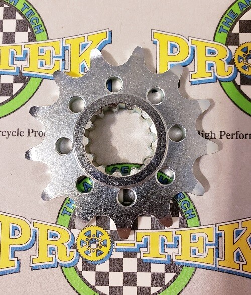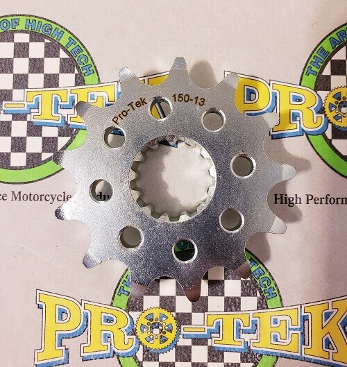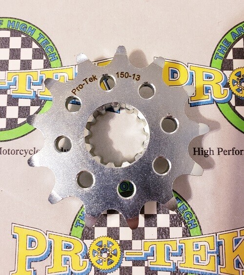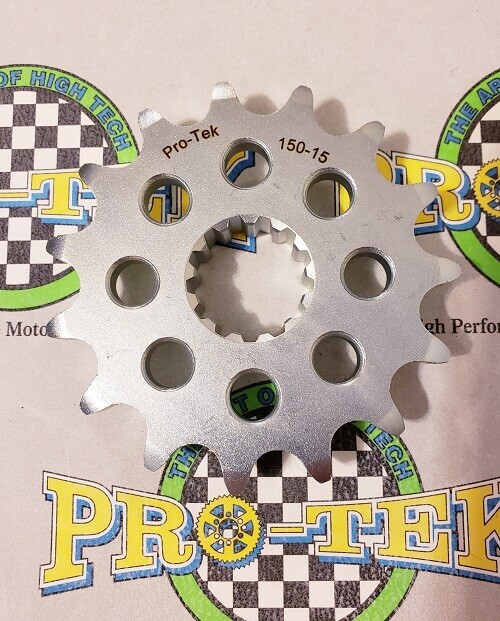 Pro-tek front sprockets are also completely CNC machined to exact tolerances from 4140 nickel-chromoly steel resulting in a quality product. None of the Pro-tek front sprockets are gear hobbed, but are lightened with drilled holes to save on rotating mass. Every lb of rotating mass equates to a 4 lb weight reduction. The sprockets are then case hardened to Rc 58-60 and finished with a zinc plating for added durability and protection from corrosion. Made in the USA, normally retail for $29.95. This is for a 520 Pitch front sprocket 13, 14 or 15 tooth.