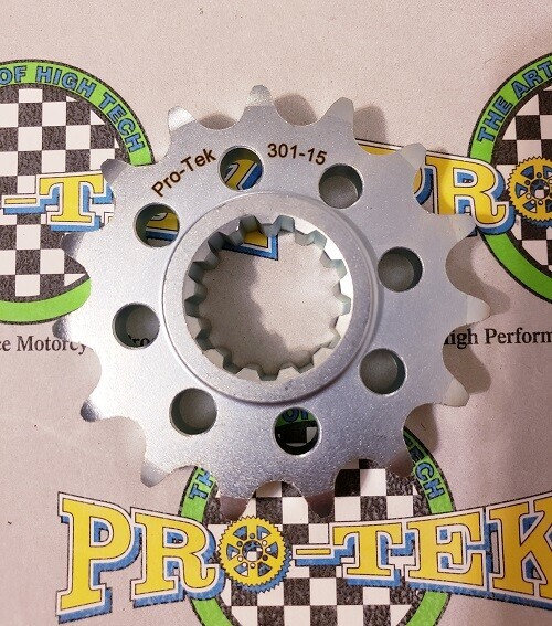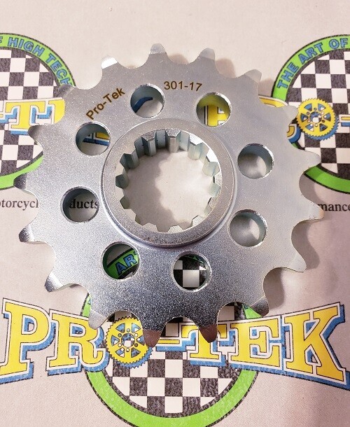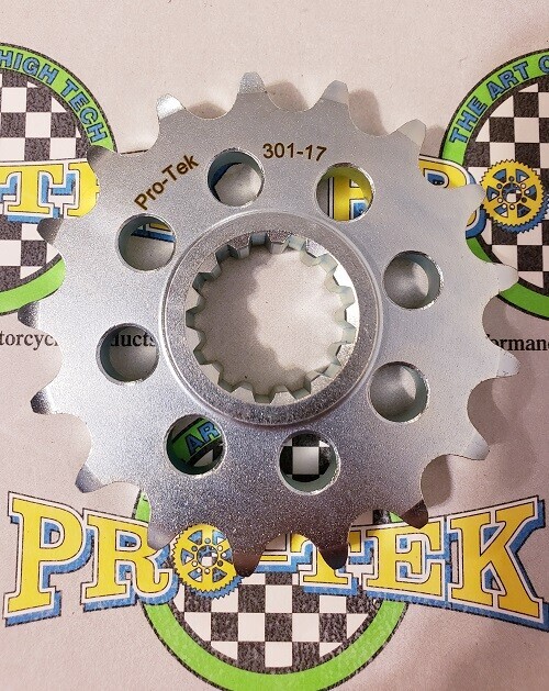 Pro-tek front sprockets are completely CNC machined to exact tolerances from 4140 nickel-chromoly steel resulting in a quality product. None of the Pro-tek front sprockets are gear hobbed, but are lightened with drilled holes to save on rotating mass. Every lb of rotating mass equates to a 4 lb weight reduction. The sprockets are then case hardened to Rc 58-60 and finished with a zinc plating for added durability and protection from corrosion. Made in the USA, normally retail for $29.95. This is for a 530 Pitch front sprocket 14, 15, 16 or 17 tooth.
