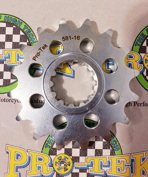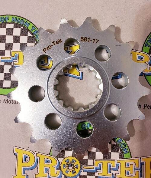 Pro-tek front sprockets are also completely CNC machined to exact tolerances from 4140 nickel-chromoly steel resulting in a quality product. None of the Pro-tek front sprockets are gear hobbed, but are lightened with drilled holes to save on rotating mass. Every lb of rotating mass equates to a 4 lb weight reduction. The sprockets are then case hardened to Rc 58-60 and finished with a zinc plating for added durability and protection from corrosion. Made in the USA, normally retail for $29.95. This is for a 525 Pitch front sprocket 14, 15, 16 or 17 tooth.