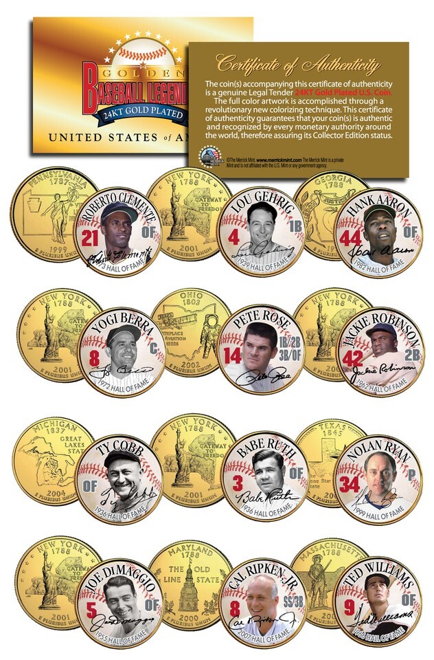 Here is your chance to own a complete set of twelve (12) 24KT Gold Plated and colorized Statehood Quarters U.S. Coins featuring HALL OF FAMERS, in this Limited Edition GOLDEN BASEBALL LEGENDS Coin Series. This 12-coin set features a rare baseball background design with each player?s statehood quarter matched to the state of his team. These high-quality, genuine Legal Tender United States coins have been layered in Genuine 24 Karat Gold, and then colorized using a unique painstaking multicolor authentic process by the Merrick Mint. Colorizing coins involves the unique application of special inks directly to the surface of a coin that achieves a level of detail, color saturation, and durability that is #1 in the coin industry. The result is an everlasting colorized coin collectible of ultra-high quality. Each 24KT Gold Plated coin features an emblematic design of the state on the reverse and colorized images of GOLDEN BASEBALL LEGENDS on the obverse (portrait of George Washington design). Each coin comes in a premium coin capsule. The 12-coin set comes with a Certificate of Authenticity to guaranty that your coins are authentic and recognized by every monetary authority around the world, assuring its Collector Edition status.
