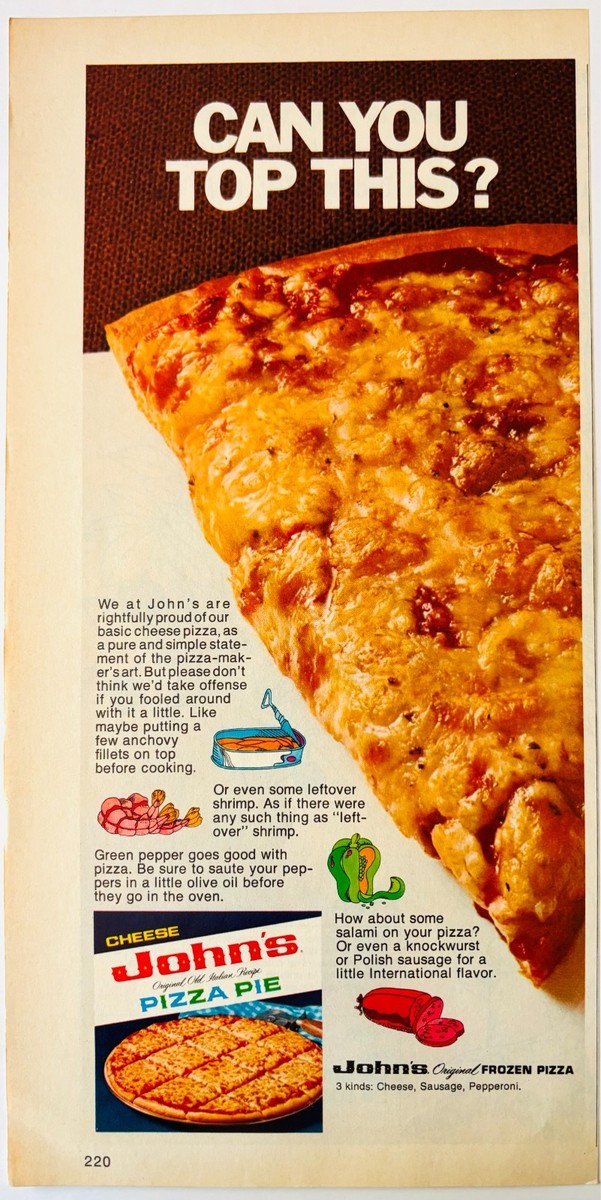 1972 John's Frozen Pizza Pie Advertisement Vintage Italian Recipe Foods DWW10F