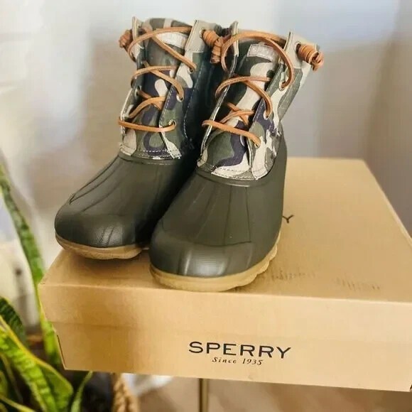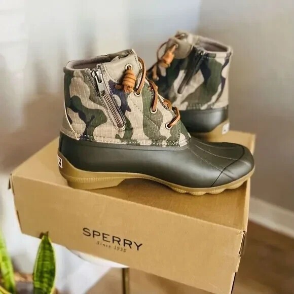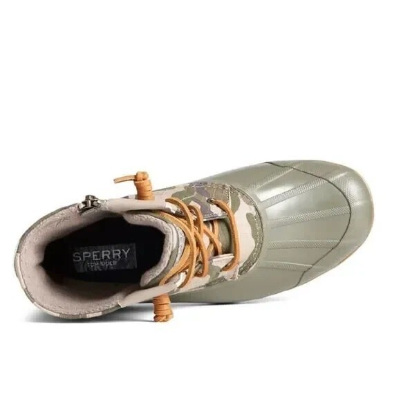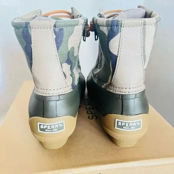 SPERRY TOP-SIDER Syren Gulf Camo Duck Toe Boot Color: Green Camo Size: 8.5 NEW WITH TAGS ATTACHED Edgy camo patterns this water-ready duck toe boot that's sure to offer comfort and style with every step. 5" shaft height Lace-up closure Cushioned insole Duck toe Textile and synthetic upper/textile lining/rubber sole Imported