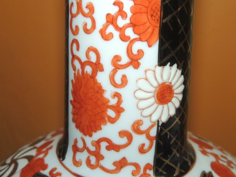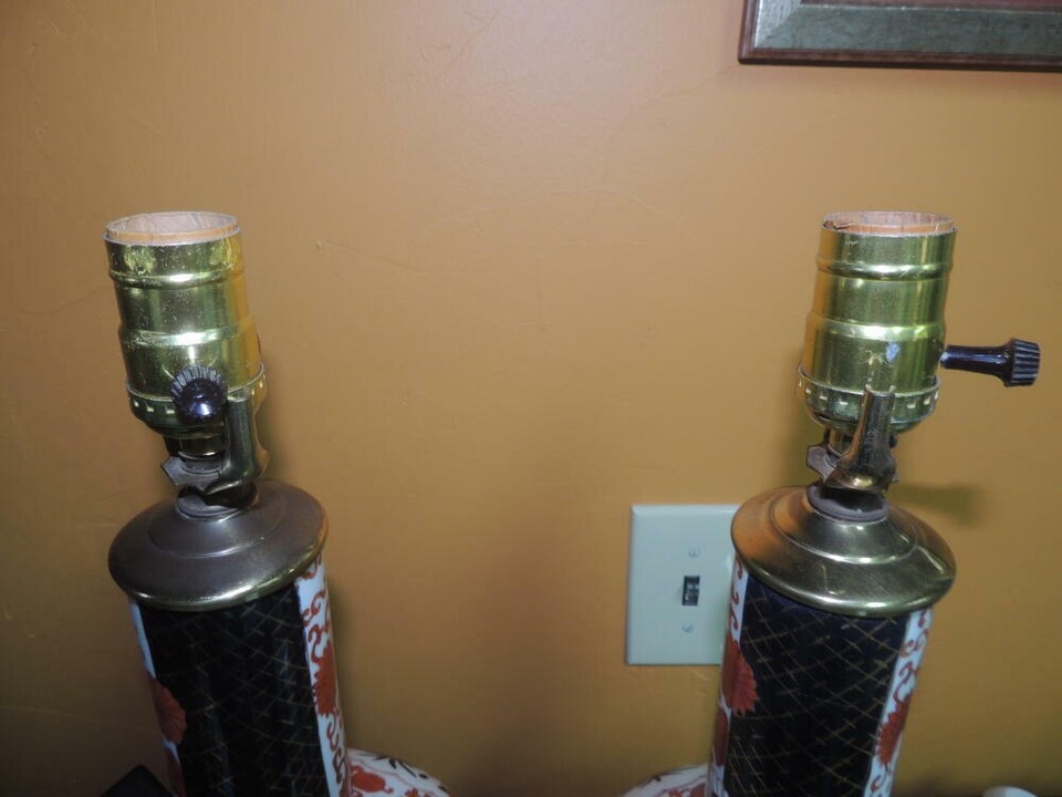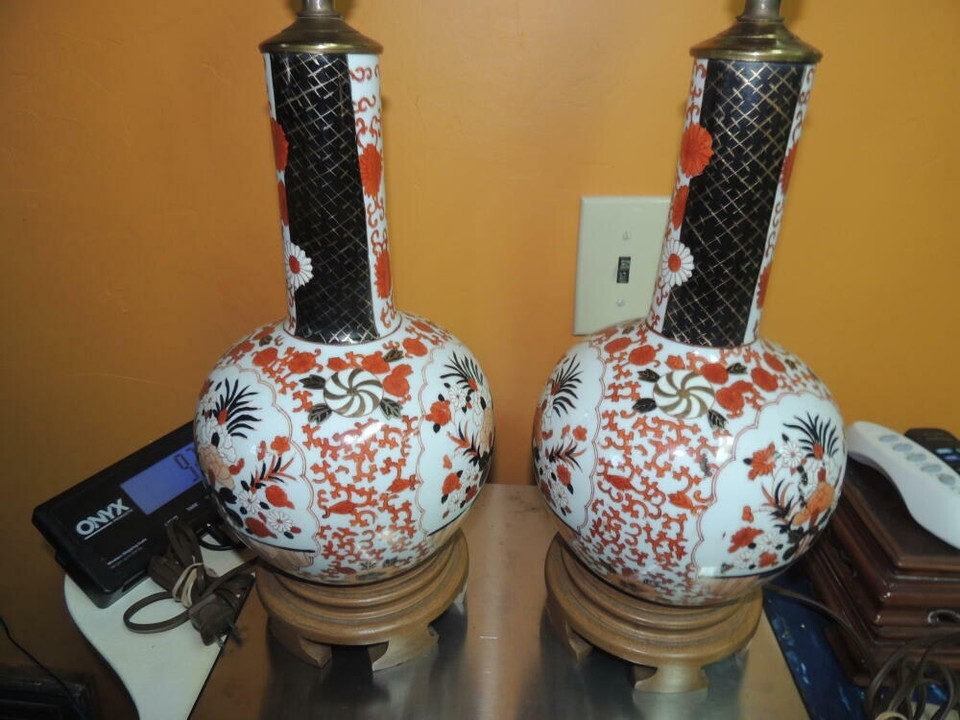 Pair Table Lamp 18.5" Porcelain Chinese red black gold Chinoiserie Rococo c1950