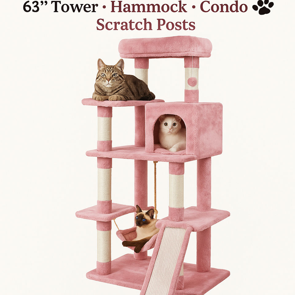 Pink Pussy Penthouse 63" Cat Tower Condo Hammock & Scratching Post Paradise