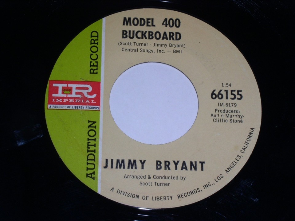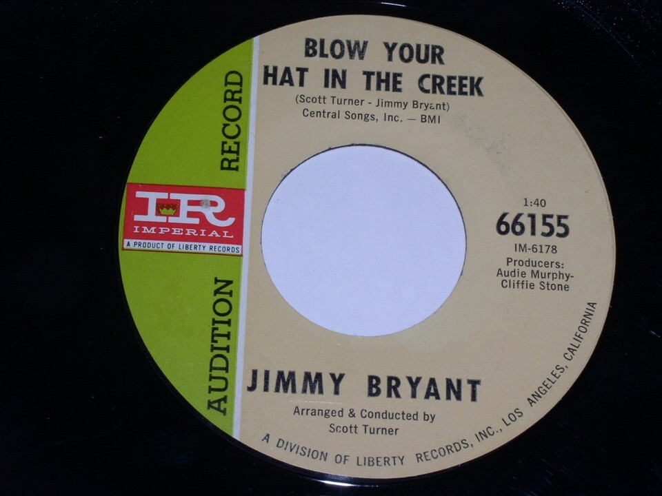 This is an original, vintage promotional 45 rpm phonograph record by Jimmy Bryant entitled, "Blow Your Hat In The Creek". Flipside: "Model 400 Buckboard". Record label Imperial 66155.