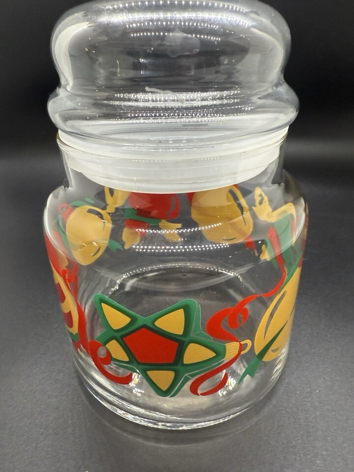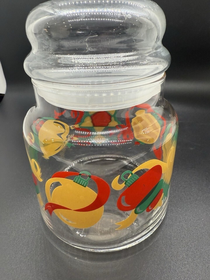 This vintage Christmas glass candy canister captures the nostalgic charm of old-fashioned holiday kitchens. The clear cylindrical glass body, festive holiday design and classic bubble lid make it perfect for displaying cocoa mixes, peppermint sticks, or miniature ornaments.